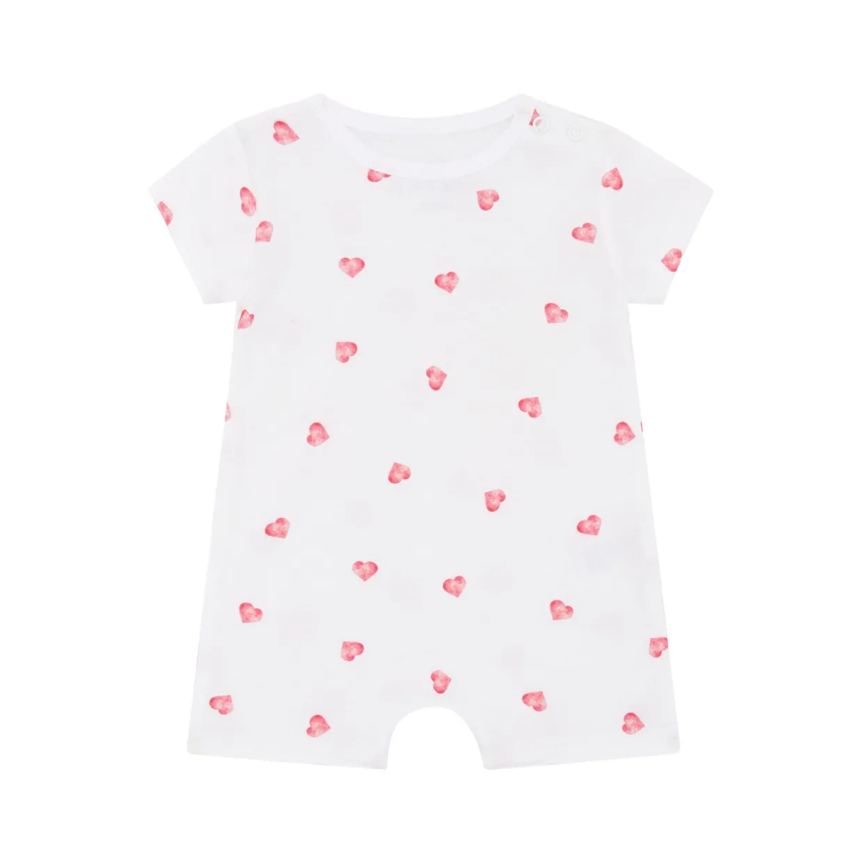- Thermoregulation, hypoallergenic, soft, breathable, moisture-wicking properties, hand-painted watercolour print, heart design, round neckline, short sleeves, popper leg openings, popper neck openings, nickel-free poppers