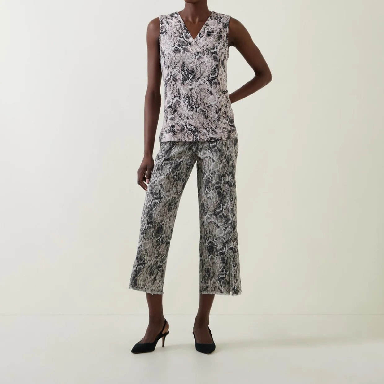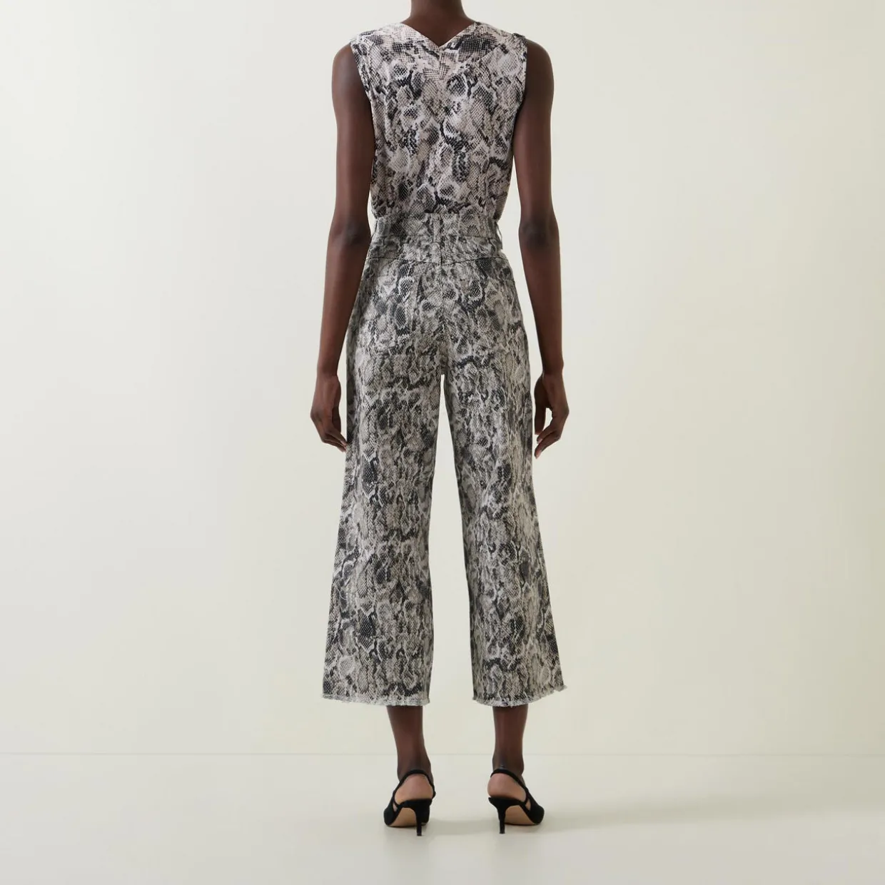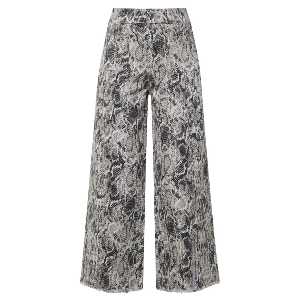 - Zip-fly and button fastening, two side in-seam pockets, two rear patch pockets, rear logo tag, snake print, high-rise, wide-cut leg, frayed edges