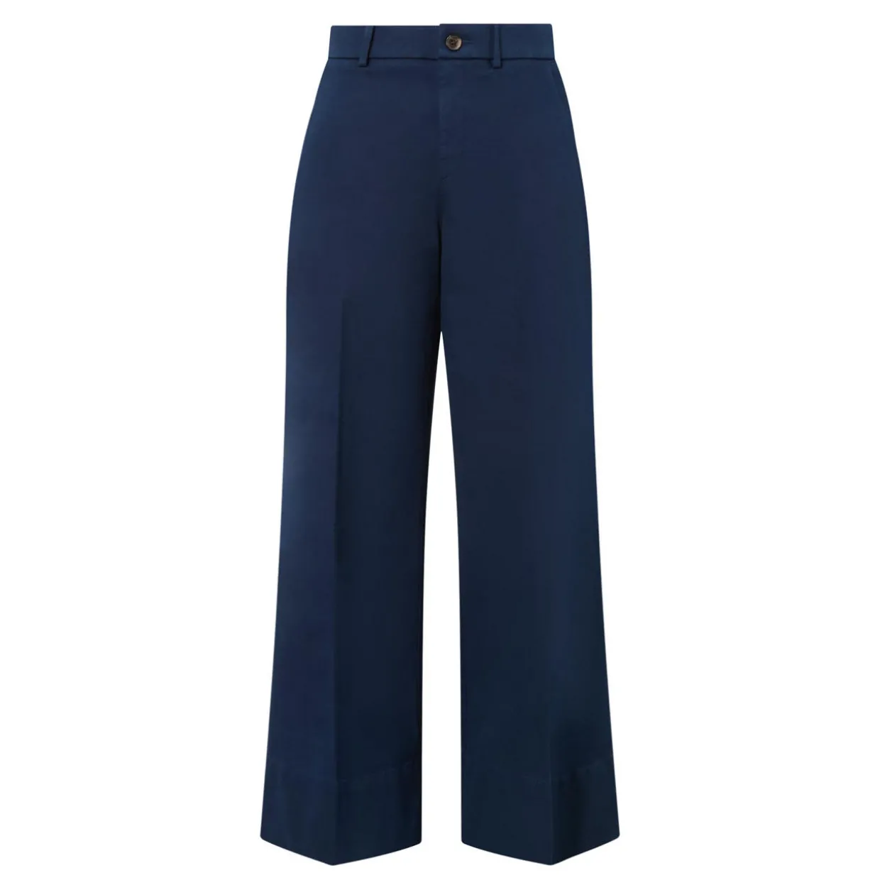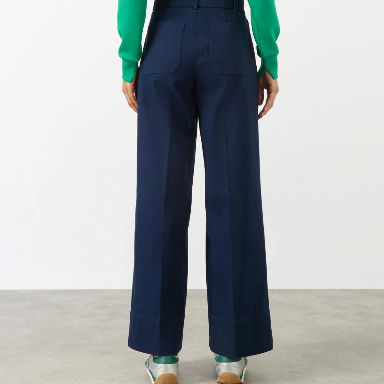 - Zip-fly and button fastening, belt loops, two side in-seam pockets, two rear patch pockets, tonal stitching, high-rise, wide-cut leg, pressed creases, twill fabrication