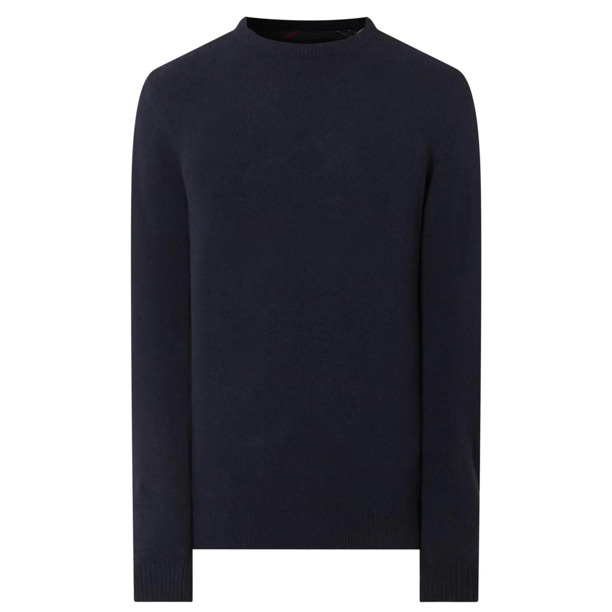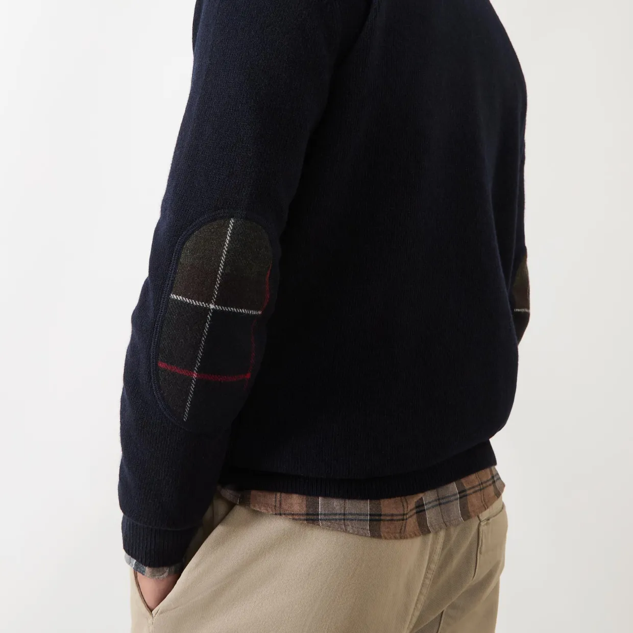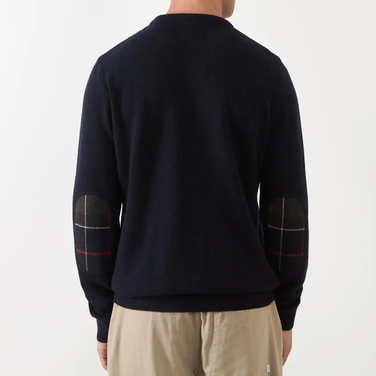 - Crew neckline, long sleeves, ribbed trims, tartan elbow patches, pullover style, knitted finish