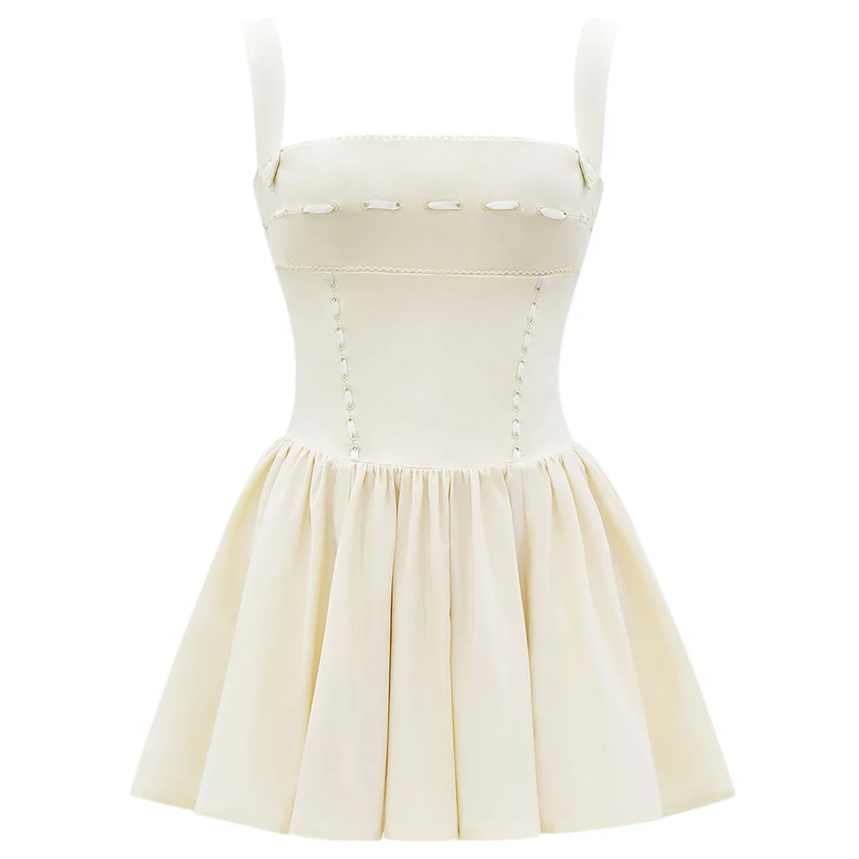 - Mini length, threaded ribbon detailing, corset-inspired bodice, square neckline, scalloped trim, shoulder straps with button detail, flared skirt, zip fastening, stretch-fused fabric