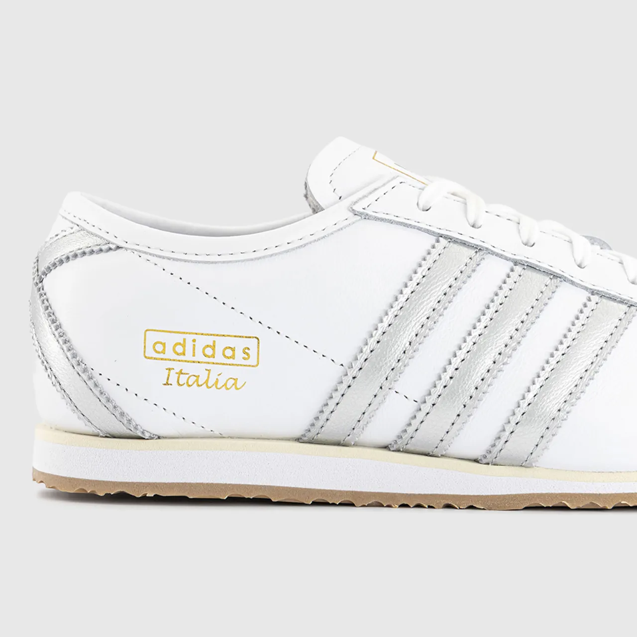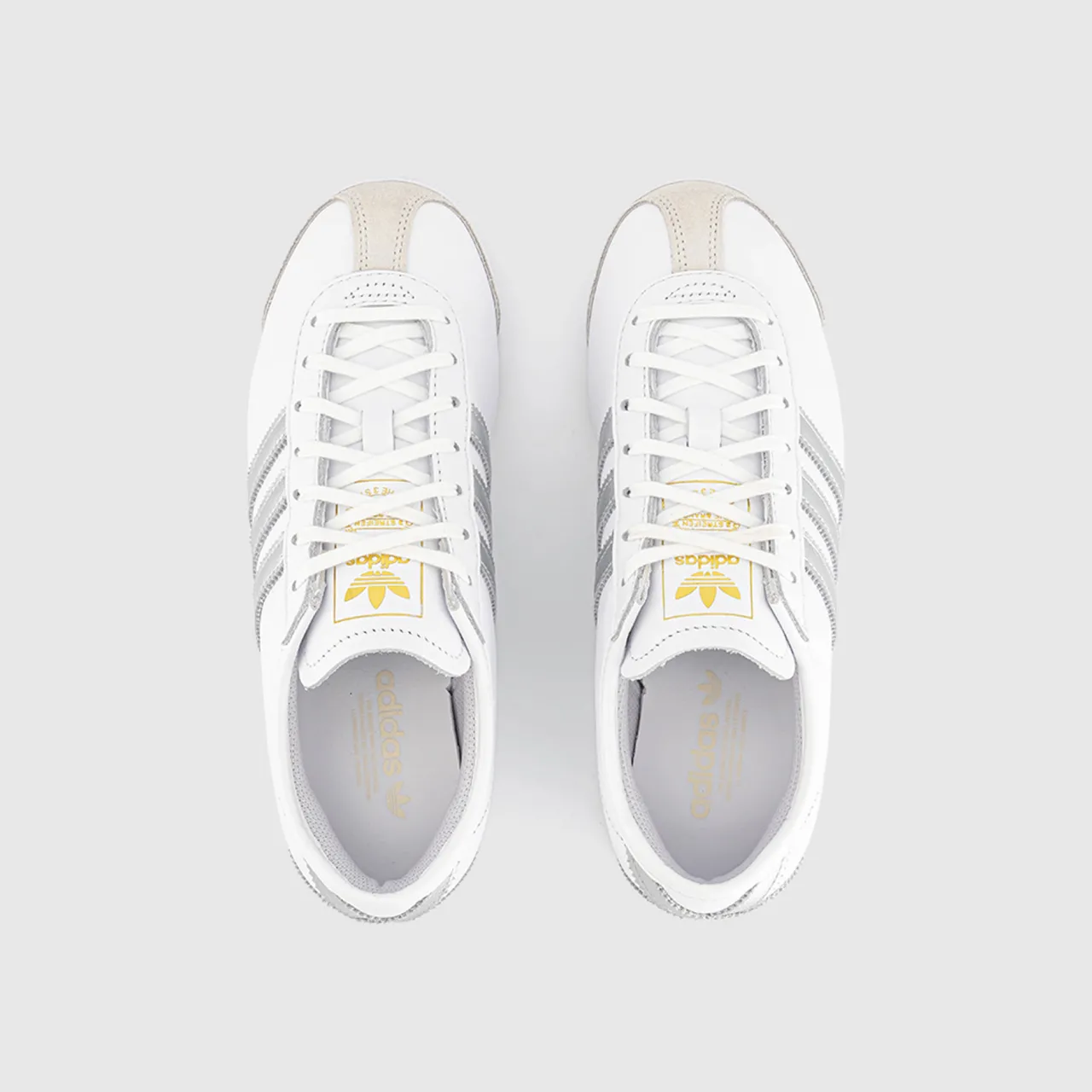 - Low-top profile, lace-up fastening, three-stripe branding, gold-tone logo detailing, textured sole, silver accents