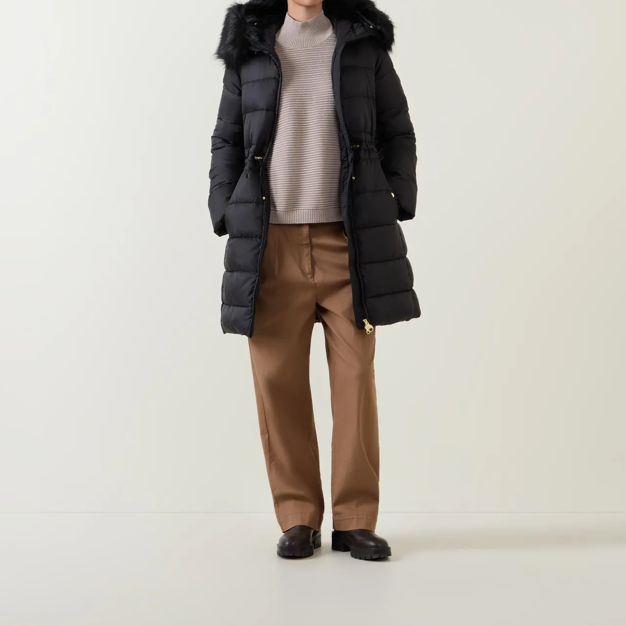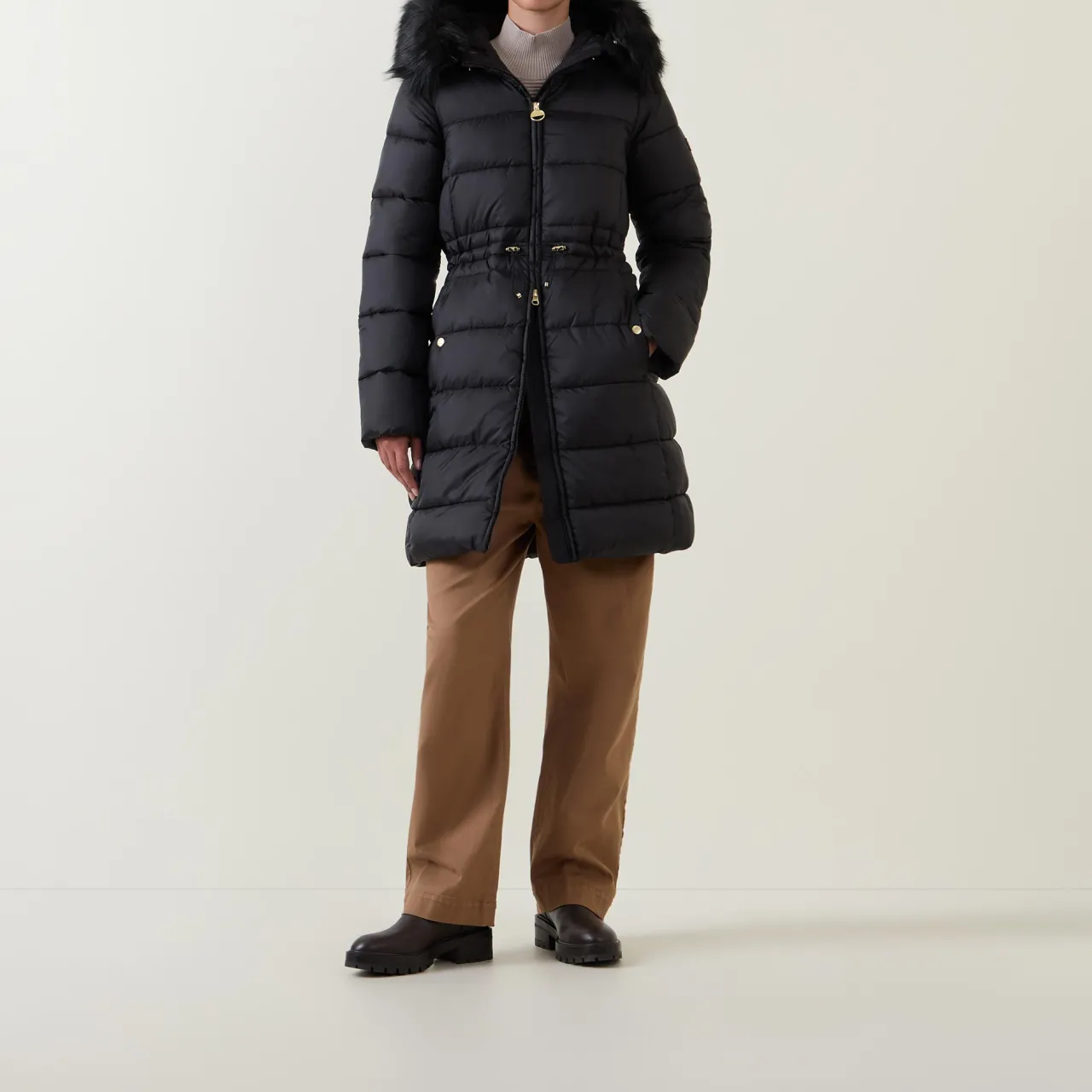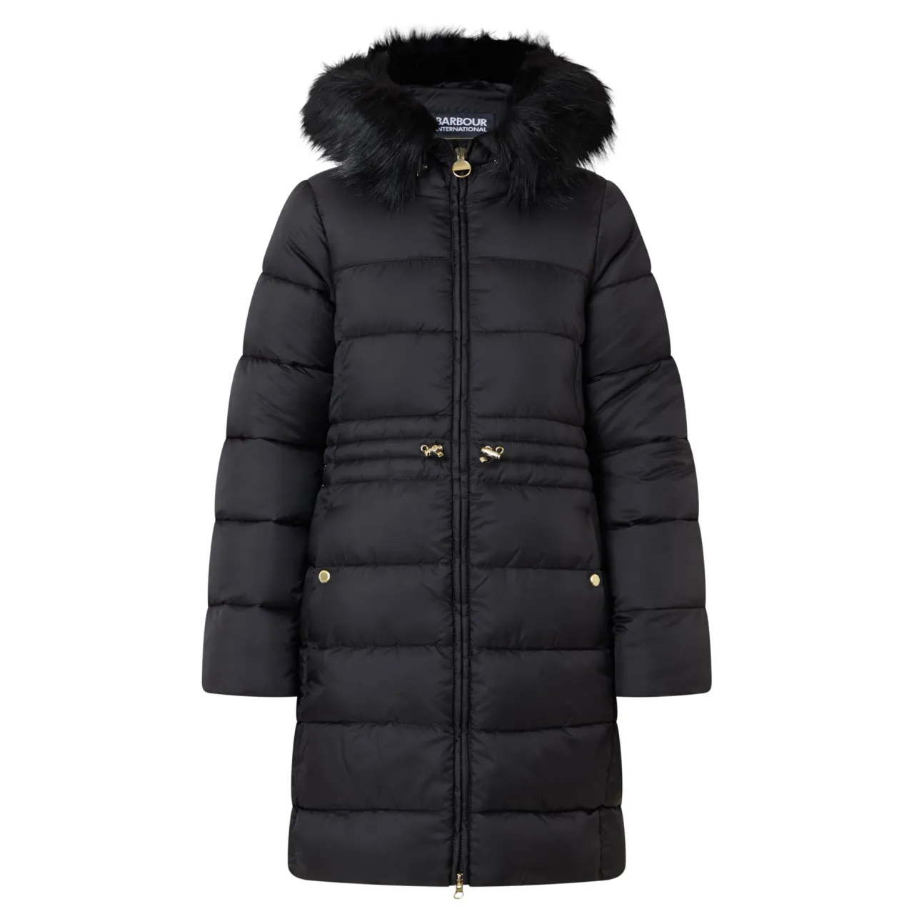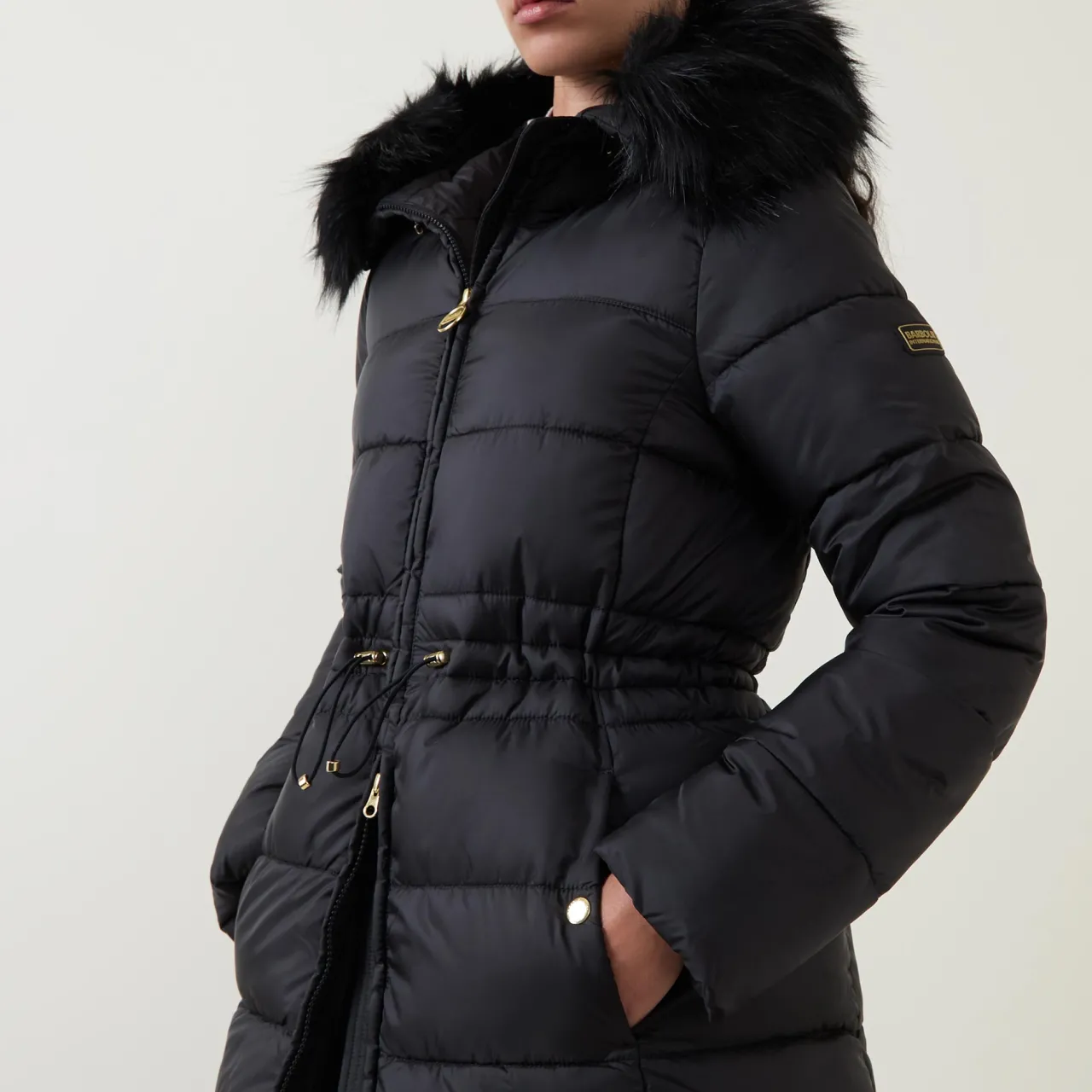 - Padded, quilted, longer length, zip fastening, faux fur hood, elasticated waist with toggle fastenings, two slip pockets, rubber logo patch