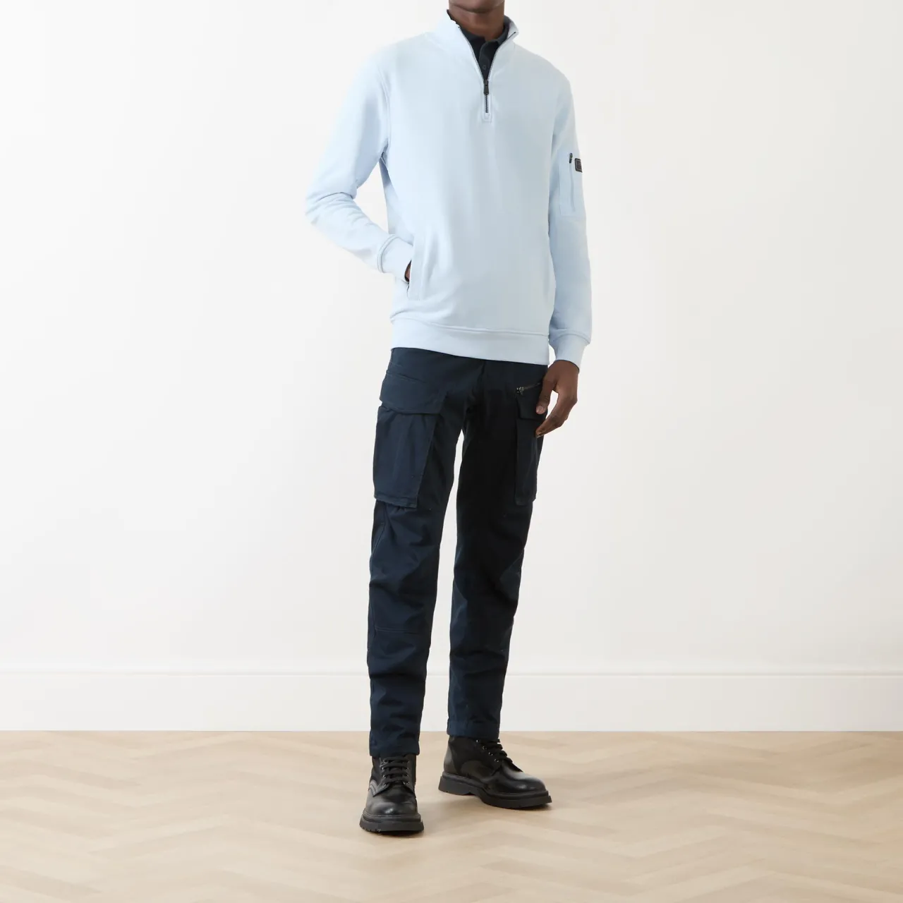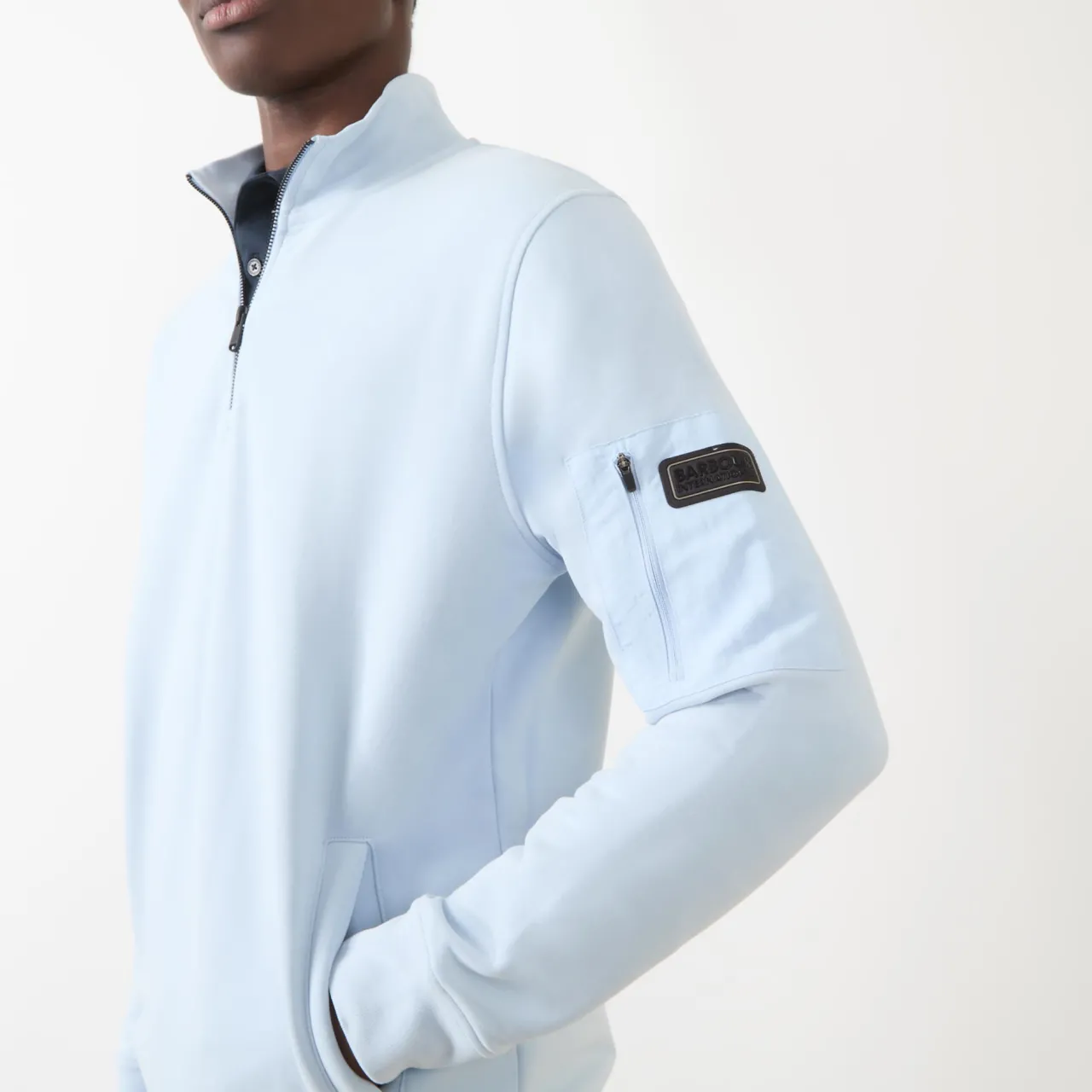 - Half-zip fastening, funnel neck, tonal logo patch to sleeve, pull-on, ribbed cuffs and hem, zip patch pocket to sleeve, two front slip pockets