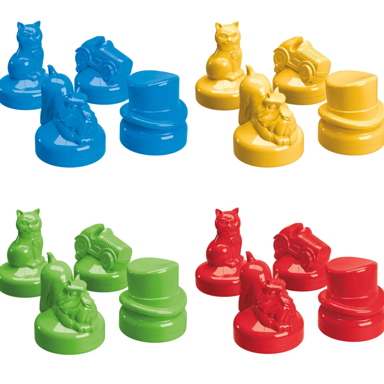- Includes Gameboard, 16 Plastic Sliding Tokens (4 red, 4 yellow, 4 green, 4 blue), 1 In Jail Card, 1 Reference Card, 4 Turn Markers (1 red, 1 yellow, 1 green, 1 blue), Money Pack, and Game Guide