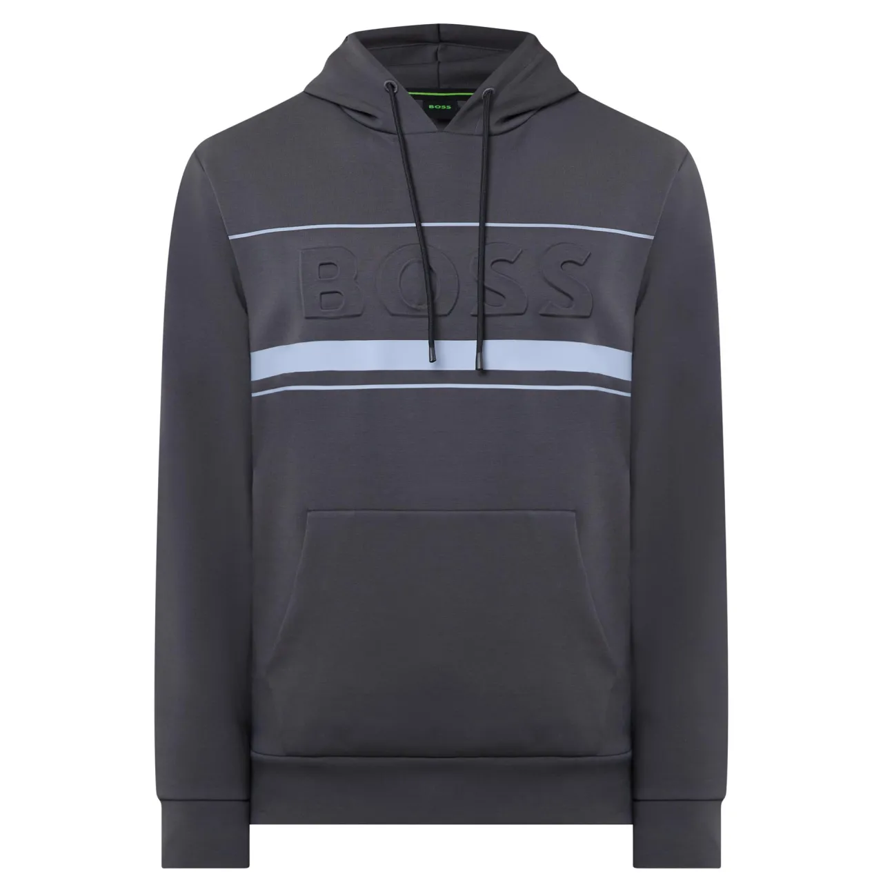 - Long sleeves, adjustable drawstring hood, embossed logo branding across the chest, front kangaroo pocket, elasticated hemline and cuffs, smooth fabric