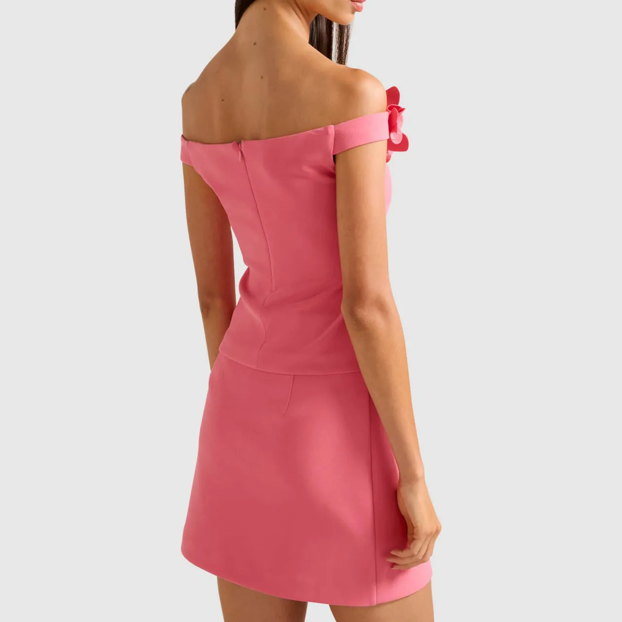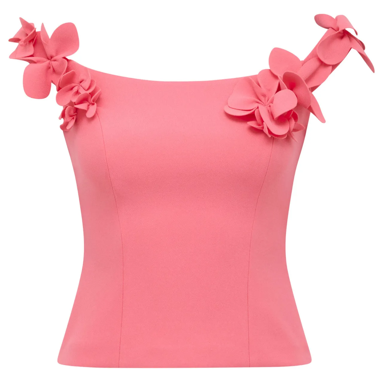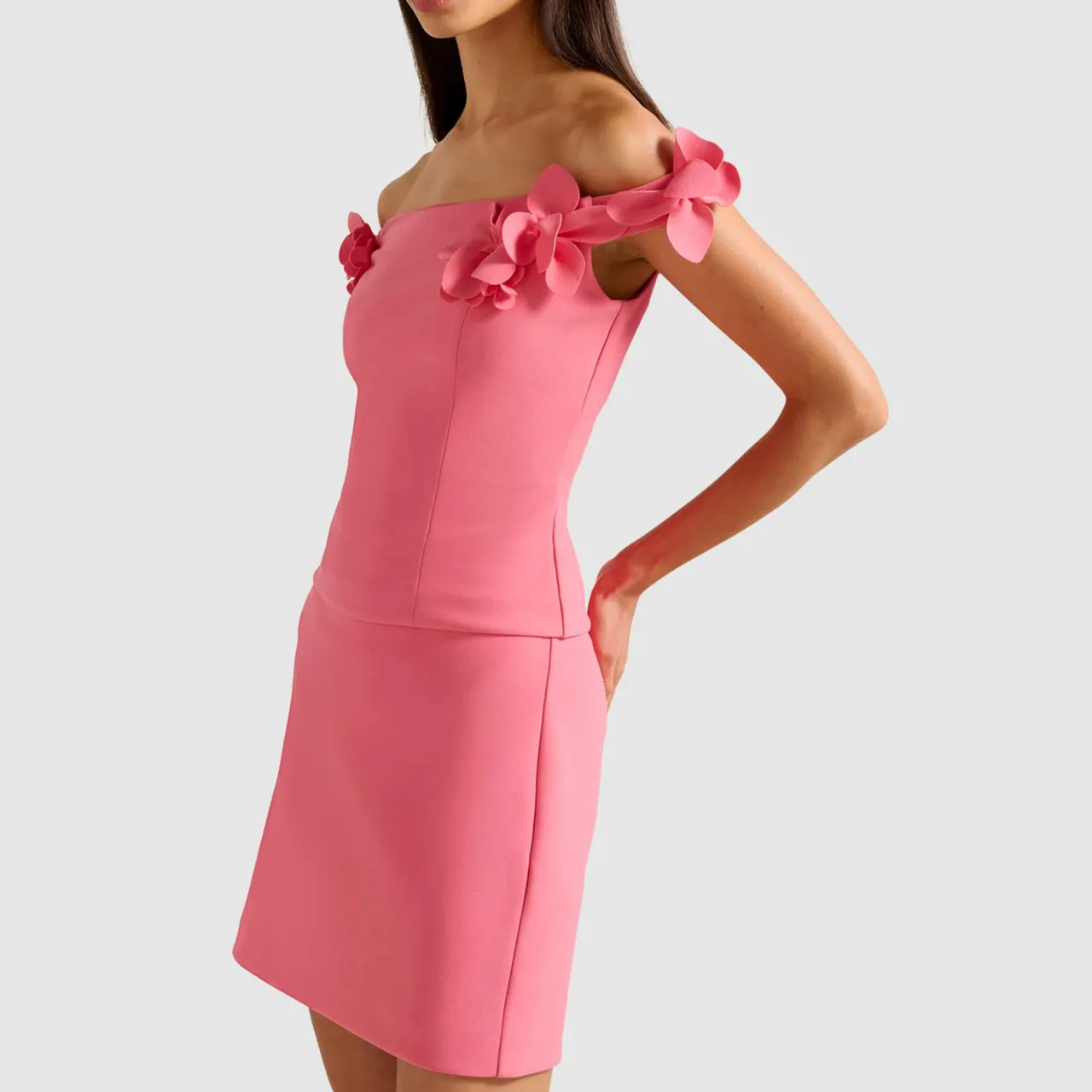 - Floral applique, Bardot neckline, knit jersey fabrication, off-the-shoulder straps