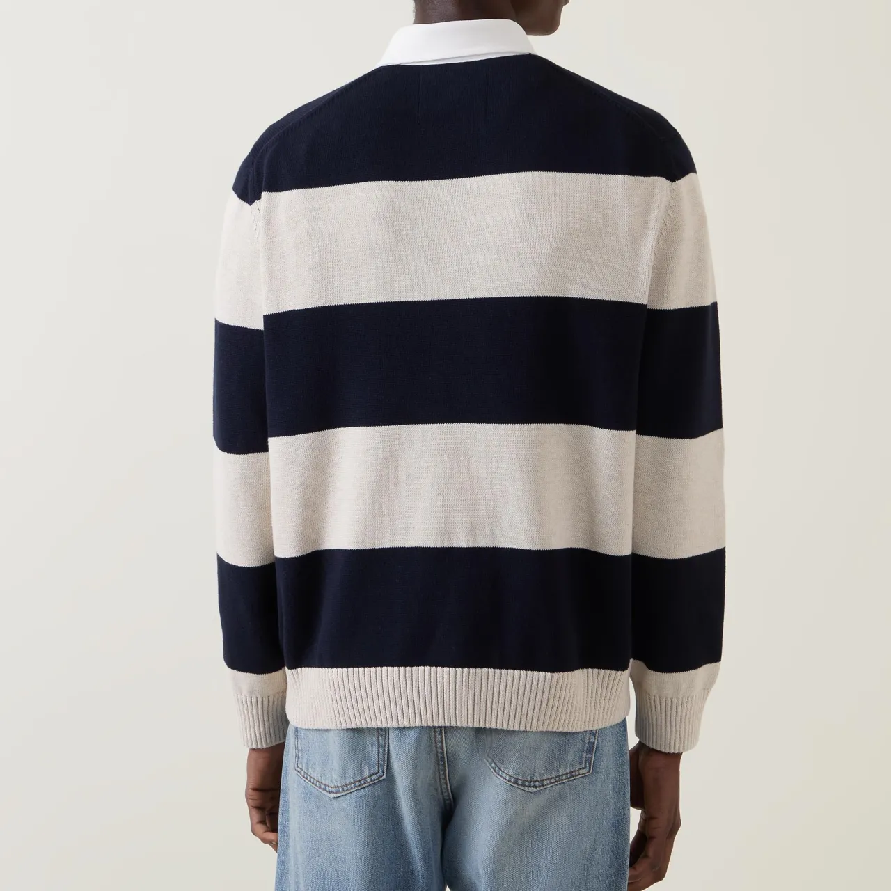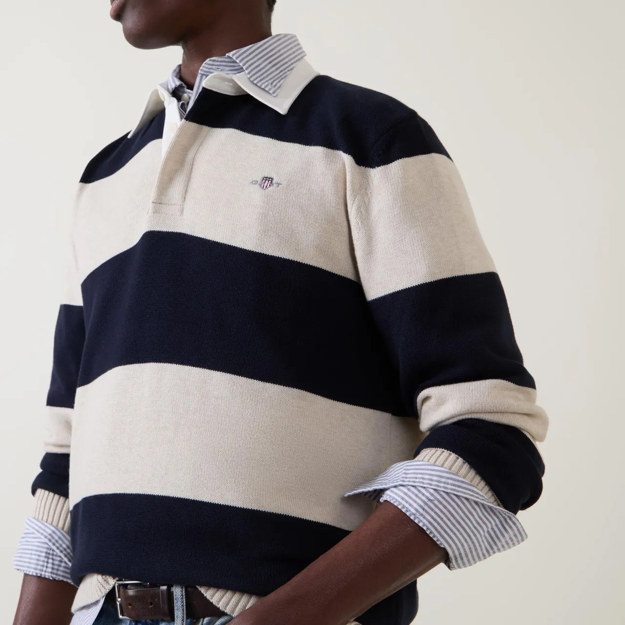 - Pointed collar, long sleeves, concealed button fastening, ribbed trims, barstripe pattern, shield logo detail