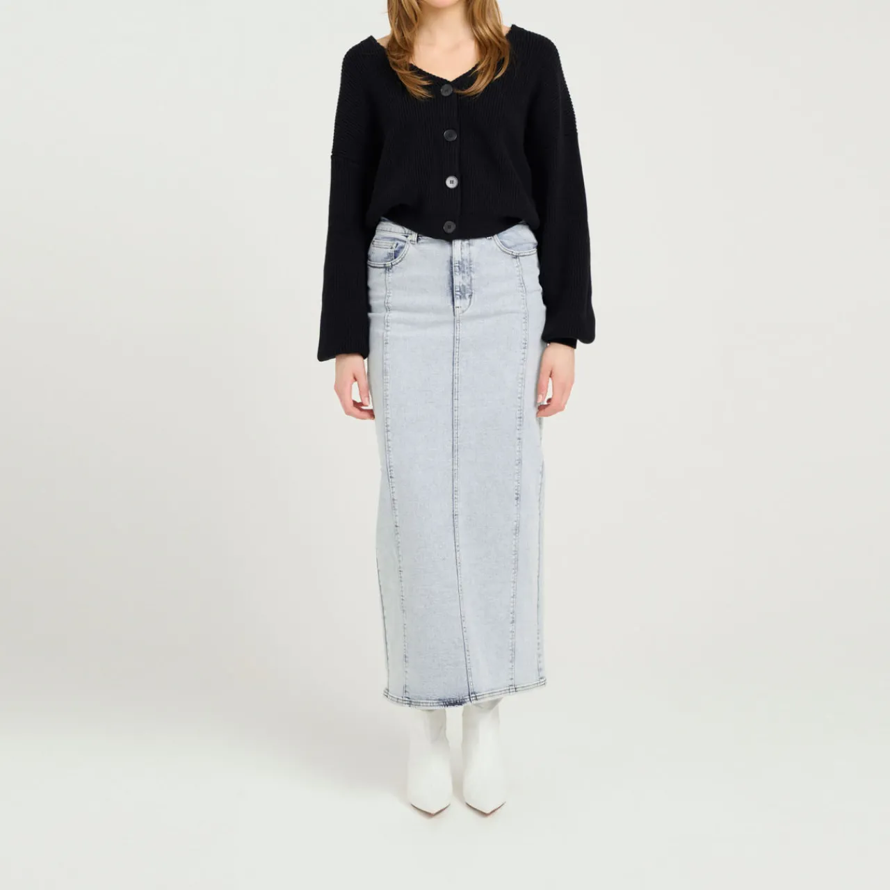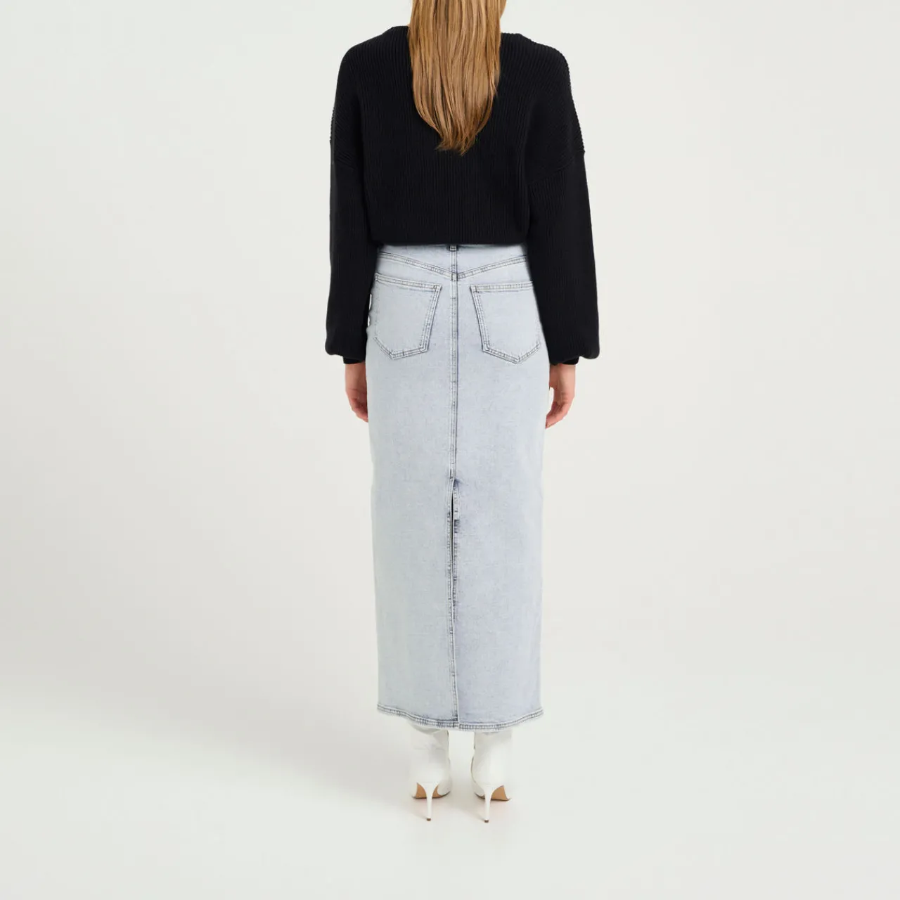 - Midrise waist, pencil silhouette, front panels, ankle length, back slit, 5 pockets, zip fly and button fastening