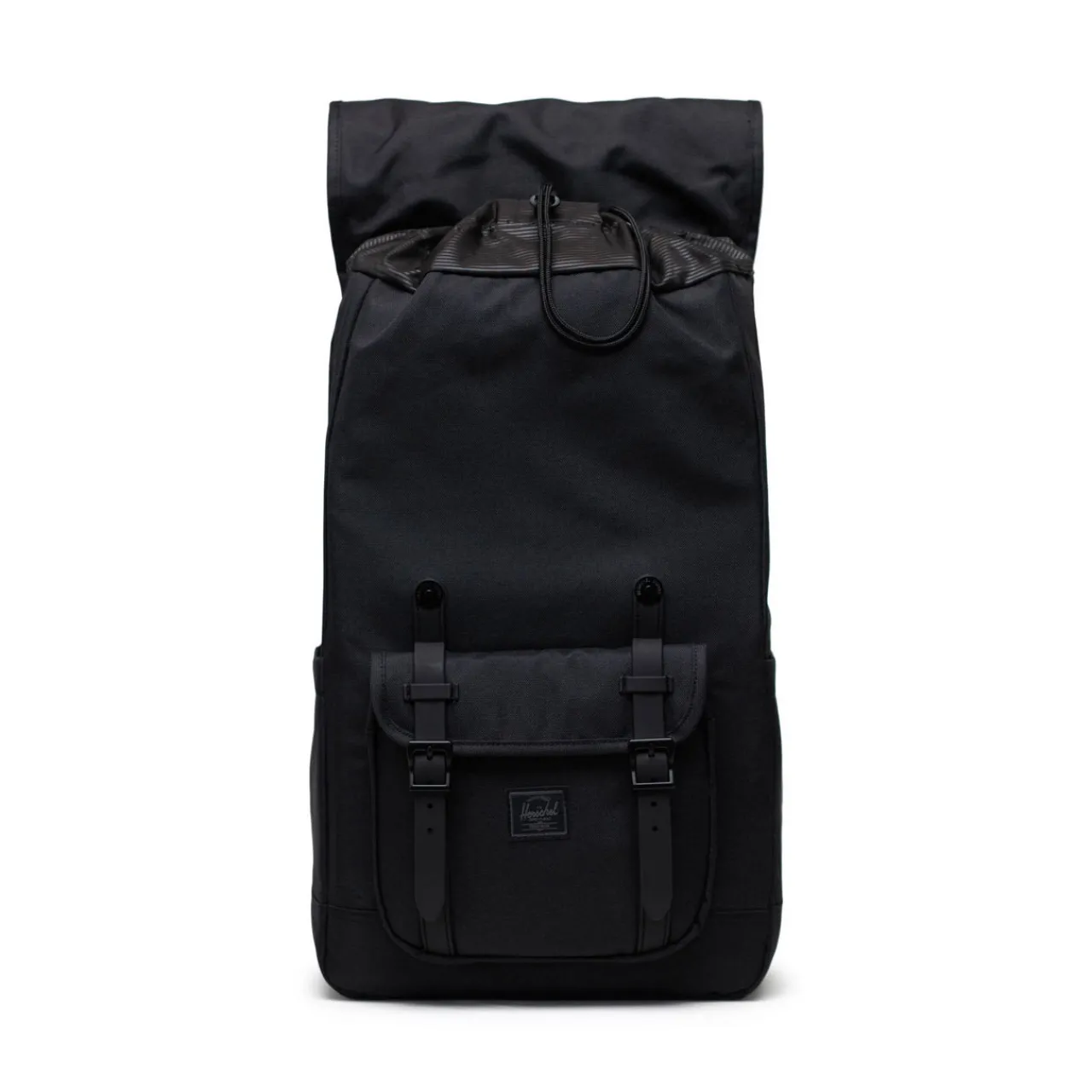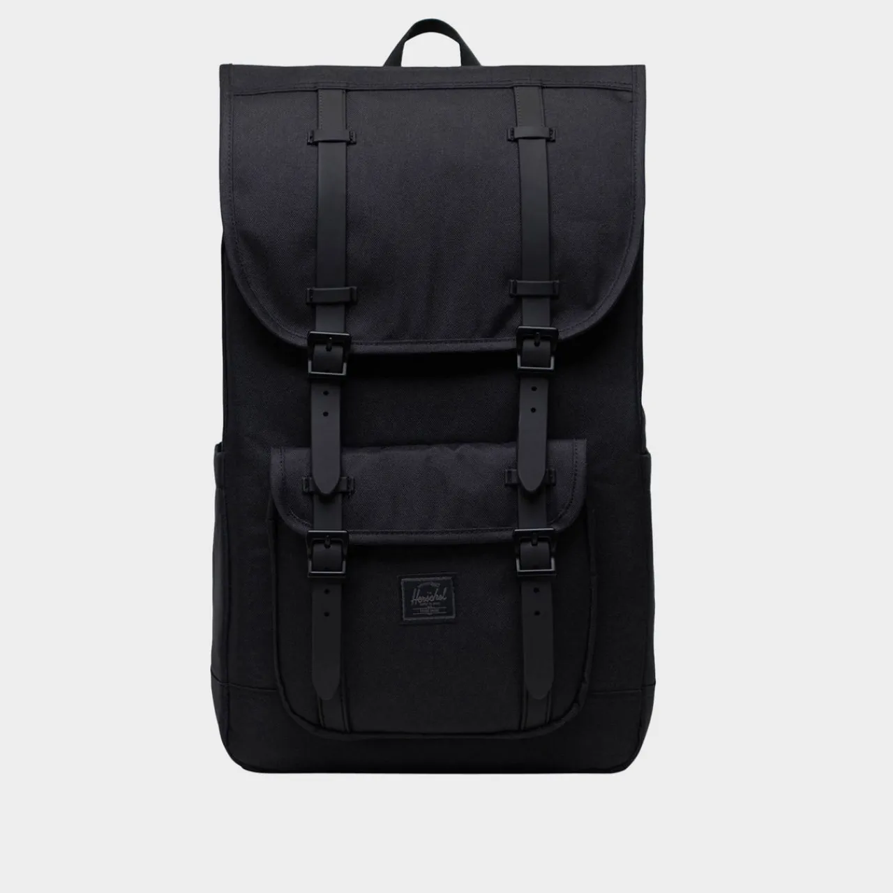 - EcoSystem™ 600D fabric, tonal stripe EcoSystem™ Liner, added and fleece lined floating sleeve, fits 15/16-inch laptops, easy U-pull drawcord closure, adjustable EVA-padded shoulder straps, sternum strap compatible, fold-over flap, magnet fastening straps with metal pin buckles, carry loop, back entry zipper, dual water bottle pockets, top lid pocket with key clip, zipped front pocket, Put Yourself Out There™ internal label, internal Herschel Supply stripe DNA tab, brand logo details