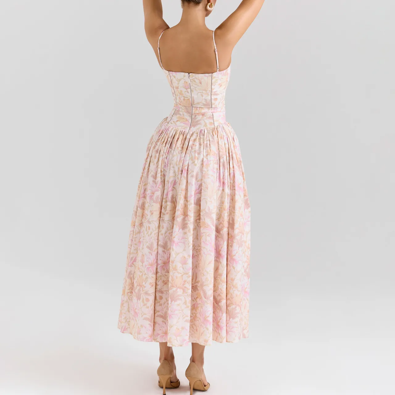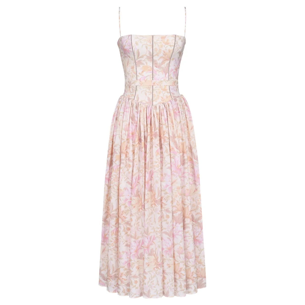 - Floral print, square bodice with contoured panelling, ladder trims, adjustable straps, volume skirt, back zip