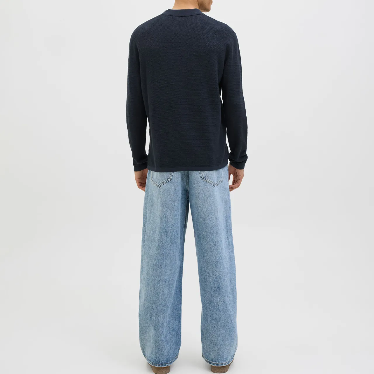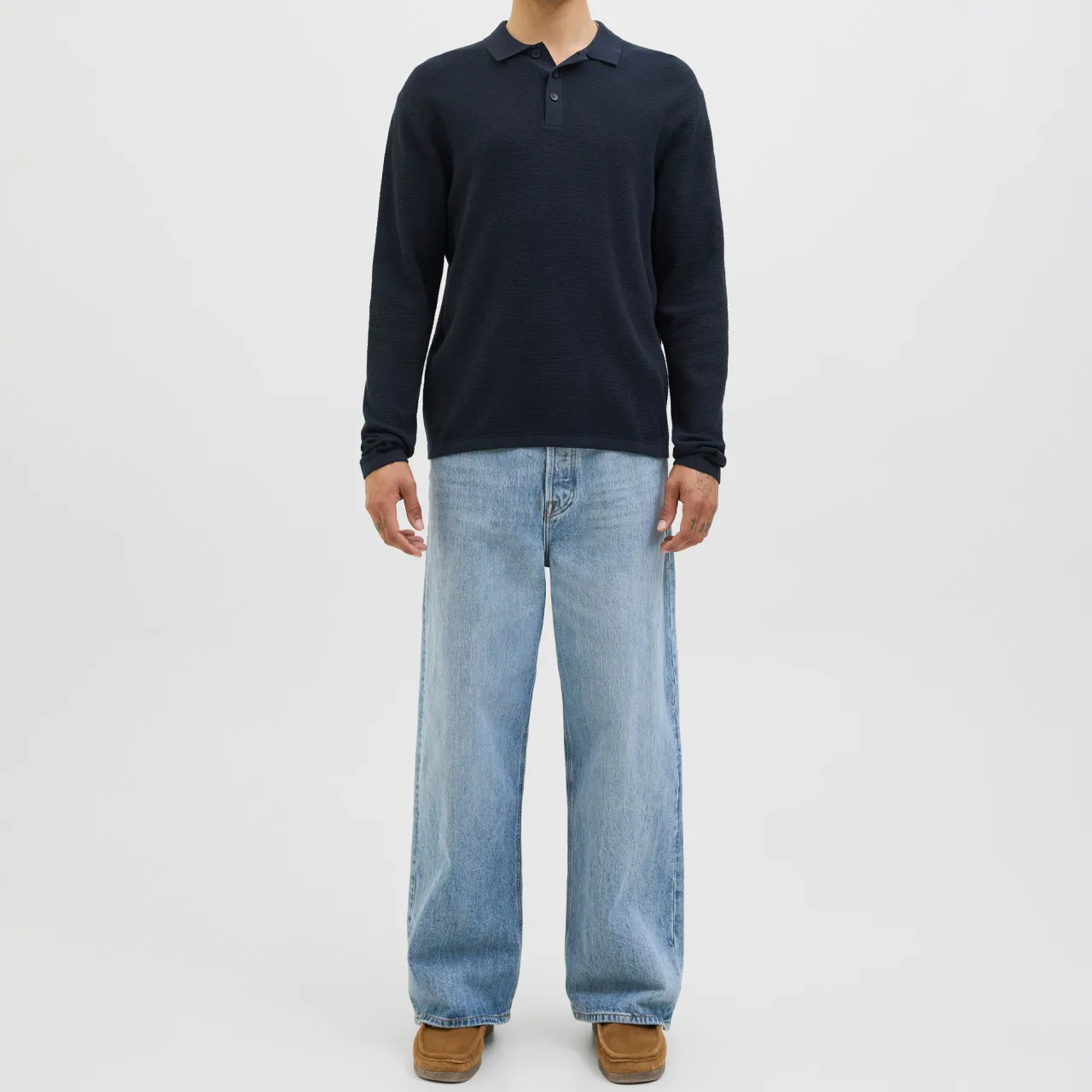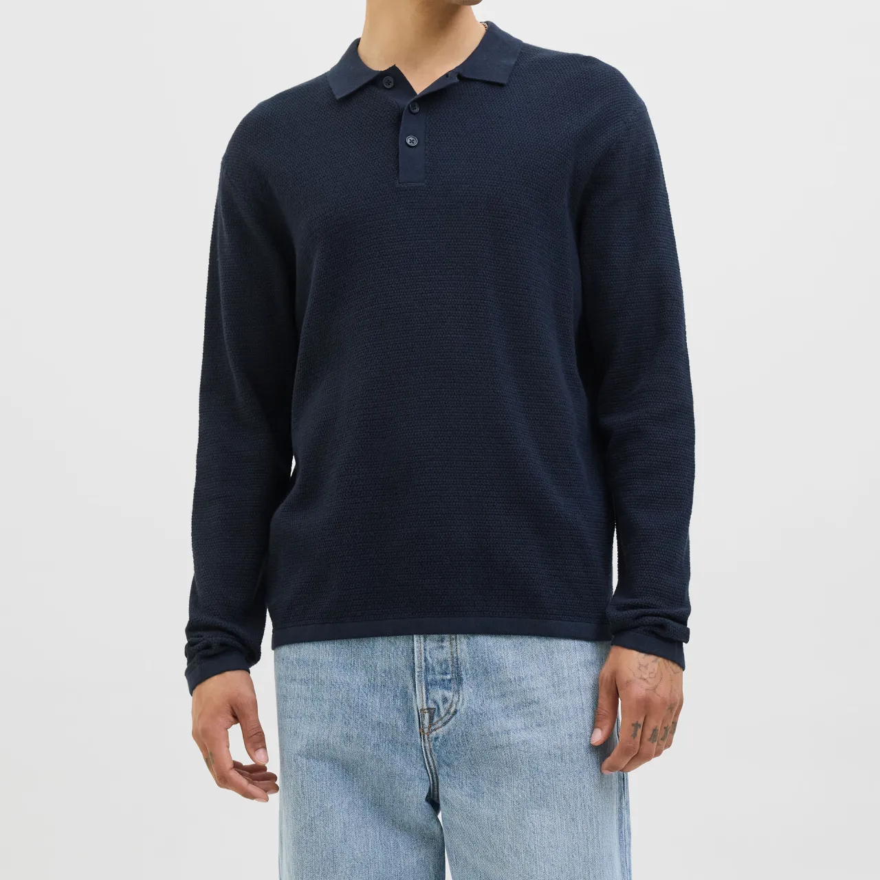 - Polo neckline, long sleeves, dropped shoulders, button fastening, flat knit construction