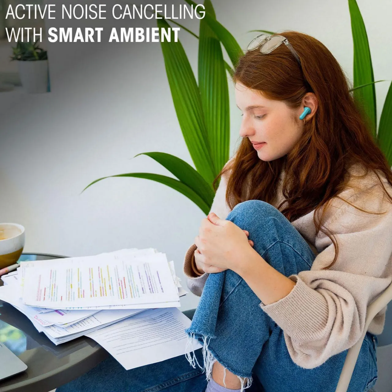 JBL Wave Beam 2 earbuds come with Active Noise Cancelling to listen to your surroundings and filter out distracting noise. Smart Ambient lets you control how much of the outside world you want to hear, so you can talk with others or stay aware of your surroundings—all without taking your earbuds out.