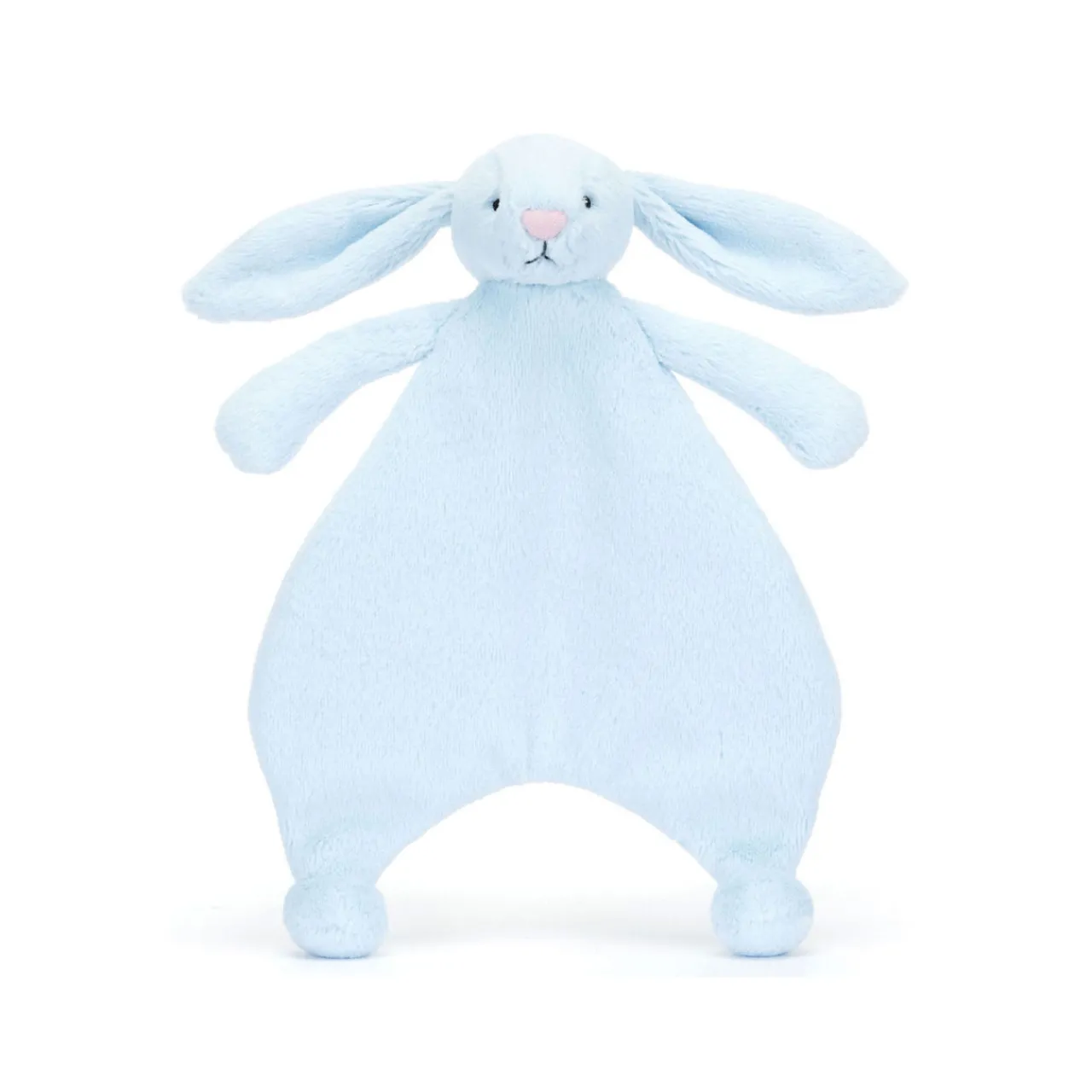 Irresistibly soft in a light blue coloured fur, the Bashful Baby Blue Bunny Comforter from Jellycat features the beloved Bashful Bunny signature long floppy ears, a pink suedette nose and embroidered eyes. Designed with an un-stuffed body, yet delicately squashy paws and bobble feet, it is easy for little hands to grab hold of and comfort themselves.
