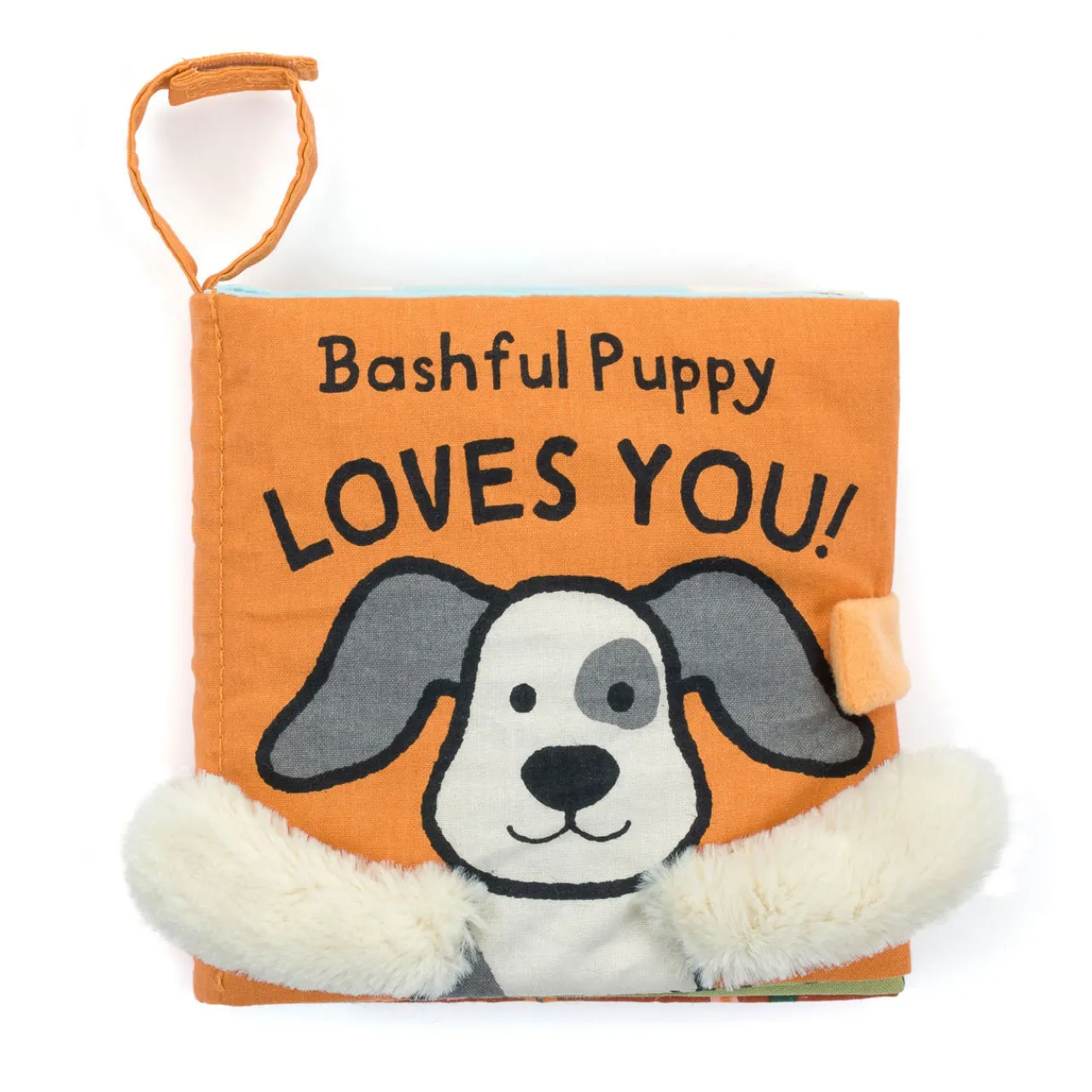 - Written and illustrated by Joy-Louise Robinson, English language, Bashful Black & Cream Puppy character, 8 pages, soft puppy paws, fabric style, crinkles, textures, colourful pictures, lift-up panels