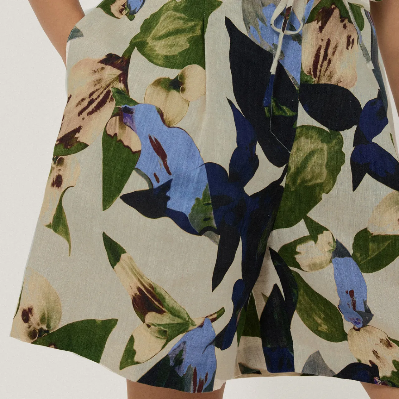 - Mid-rise, straight leg, elasticated drawstring waist, two side seam pockets, clean hems, botanic print, lightweight, breathable