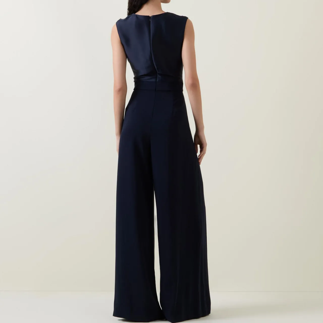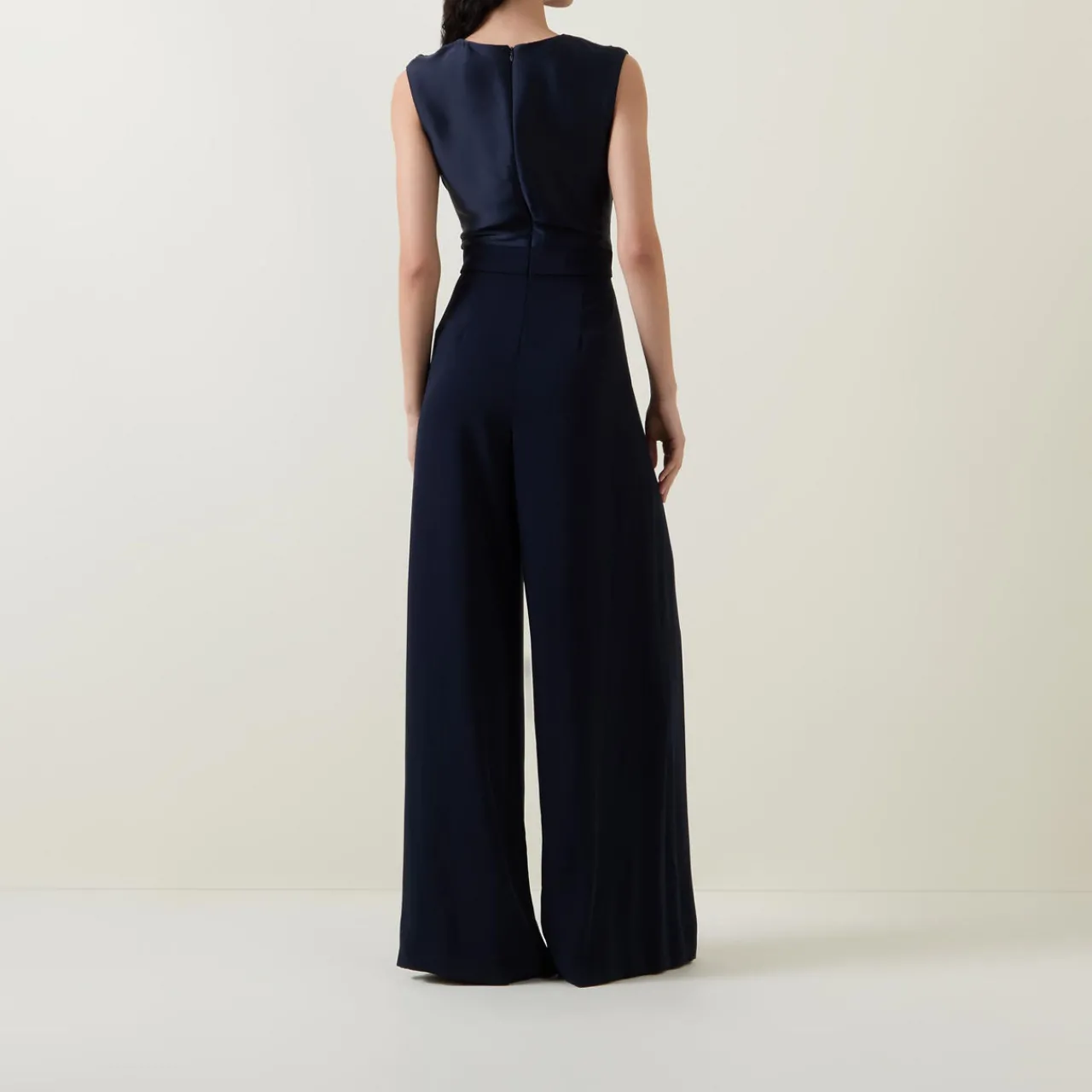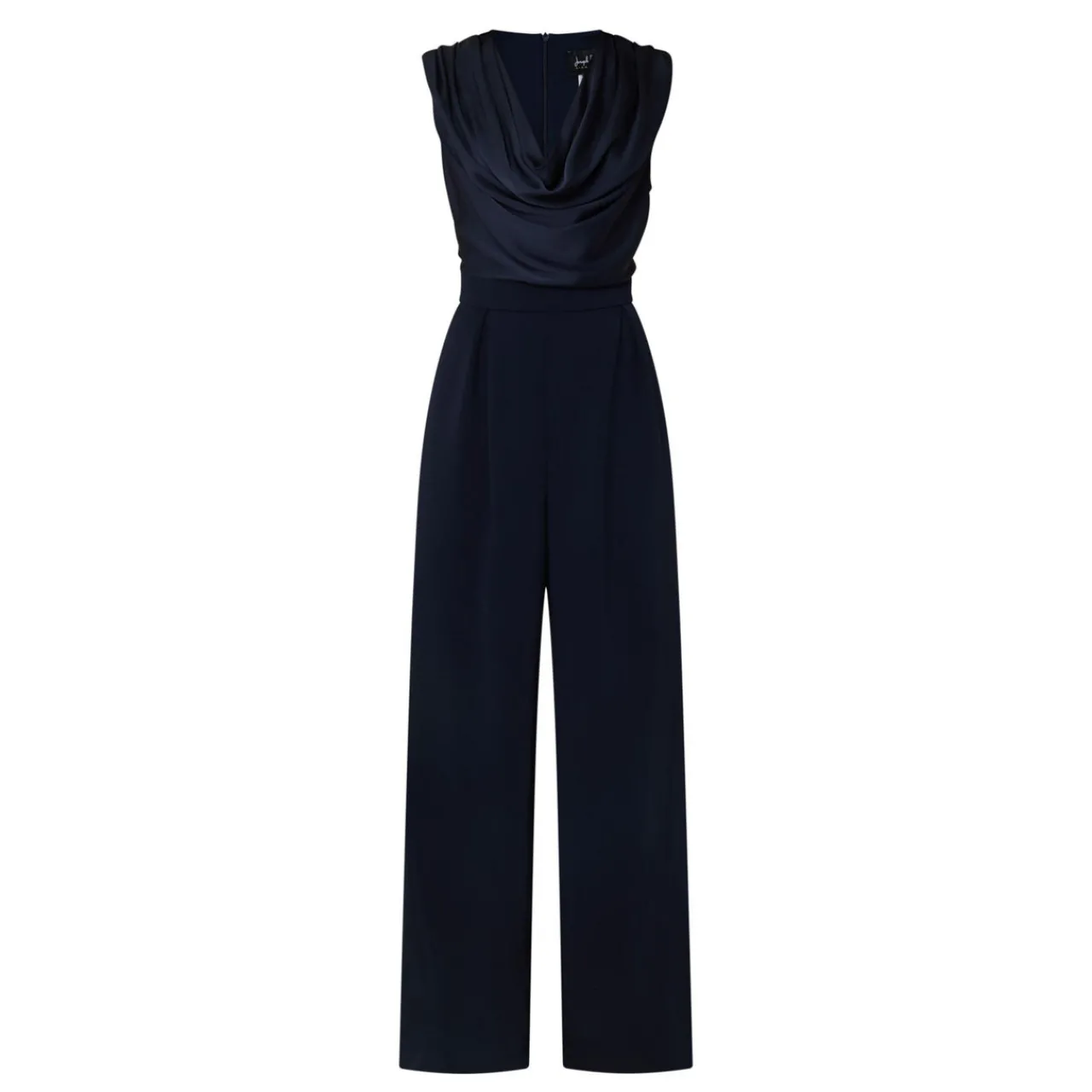 - Cowl neckline, short sleeves, extended shoulders, wide-cut legs, zip fastening at back, satin upper, pleated details