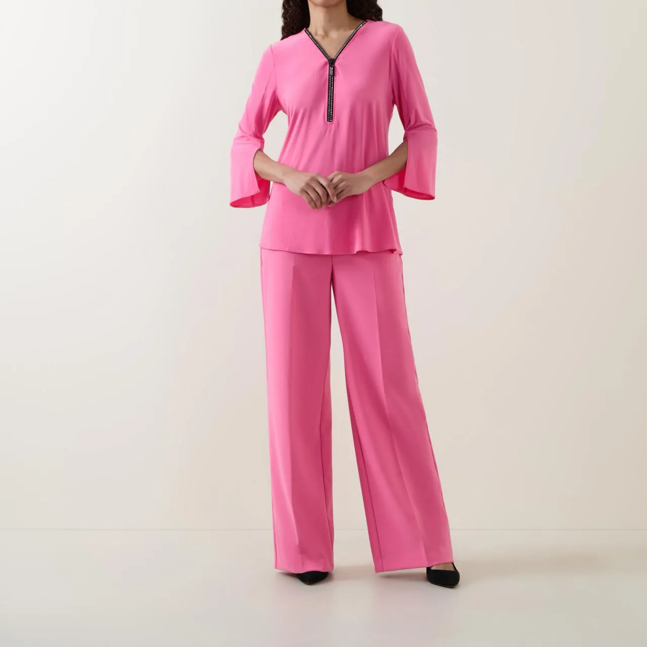 - Concealed zip-fly, inner waistband, high-rise, pressed creases, wide-cut leg, smooth fabric