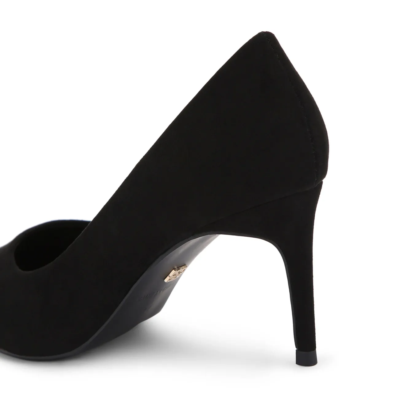 - Court style, soft microsuede fabric, gold-tone pin stud on the outsole, padded footbed, heel
