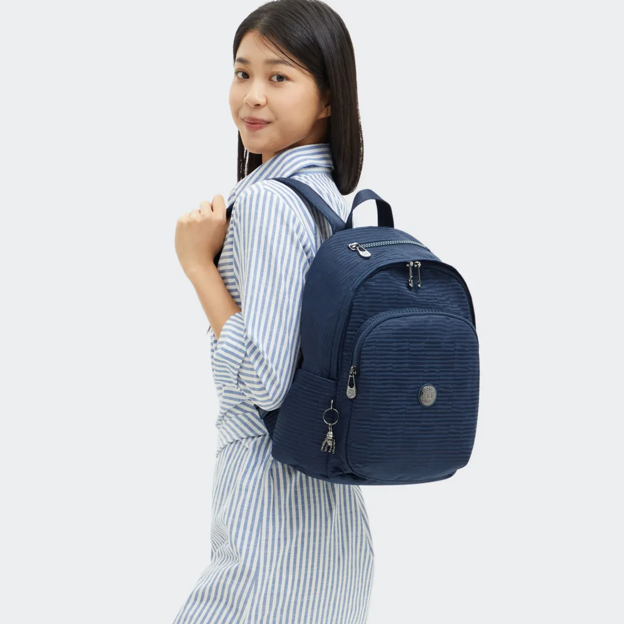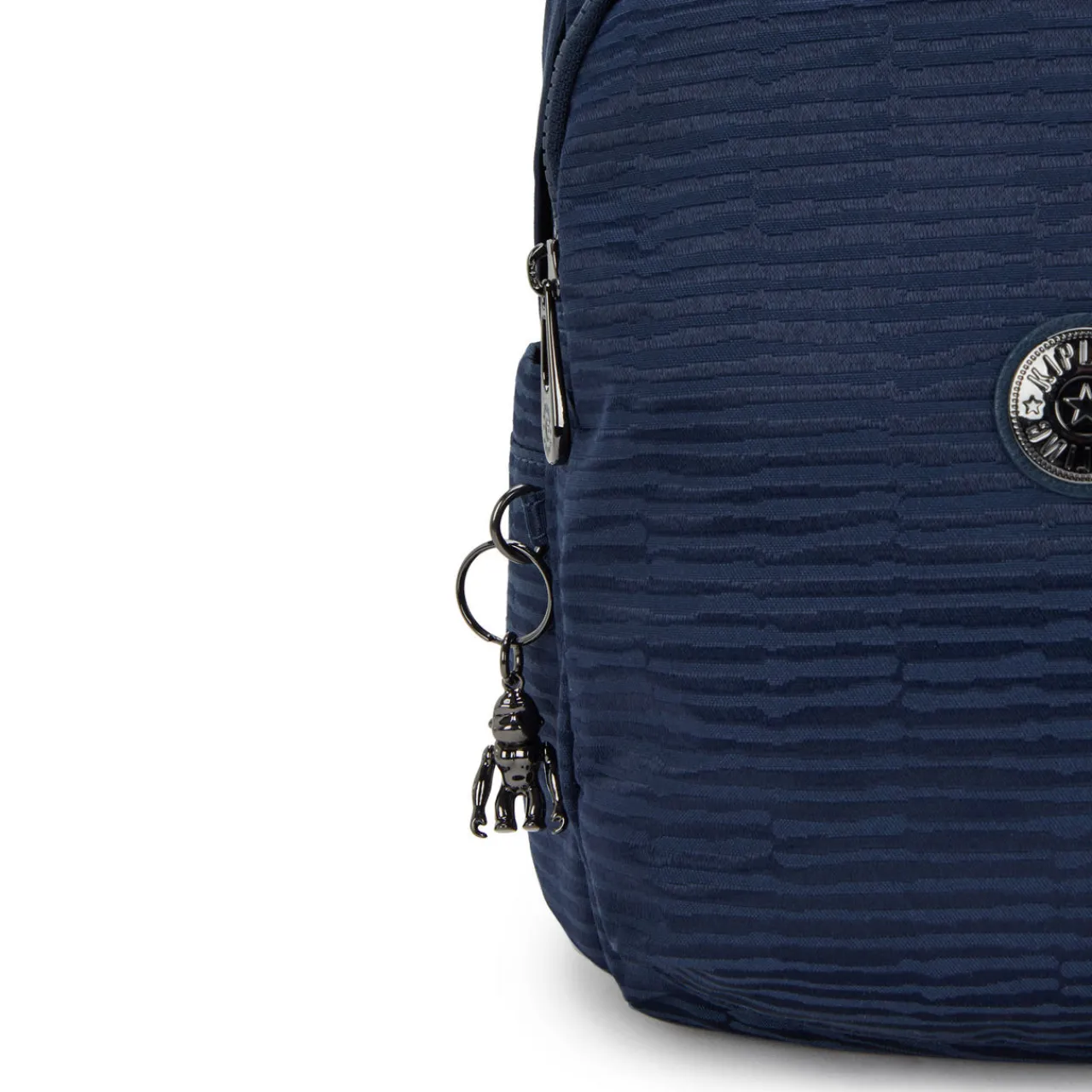 - Features: Exterior: Water repellent, two zipped front pockets, three functional compartments, two elasticated open side pockets, wide adjustable backpack straps, top handle, key fob, round brand logo, metal robot monkey keyring, lined. Interior: One zipped main compartment, one zipped pocket, one wallet compartment, two pen compartments