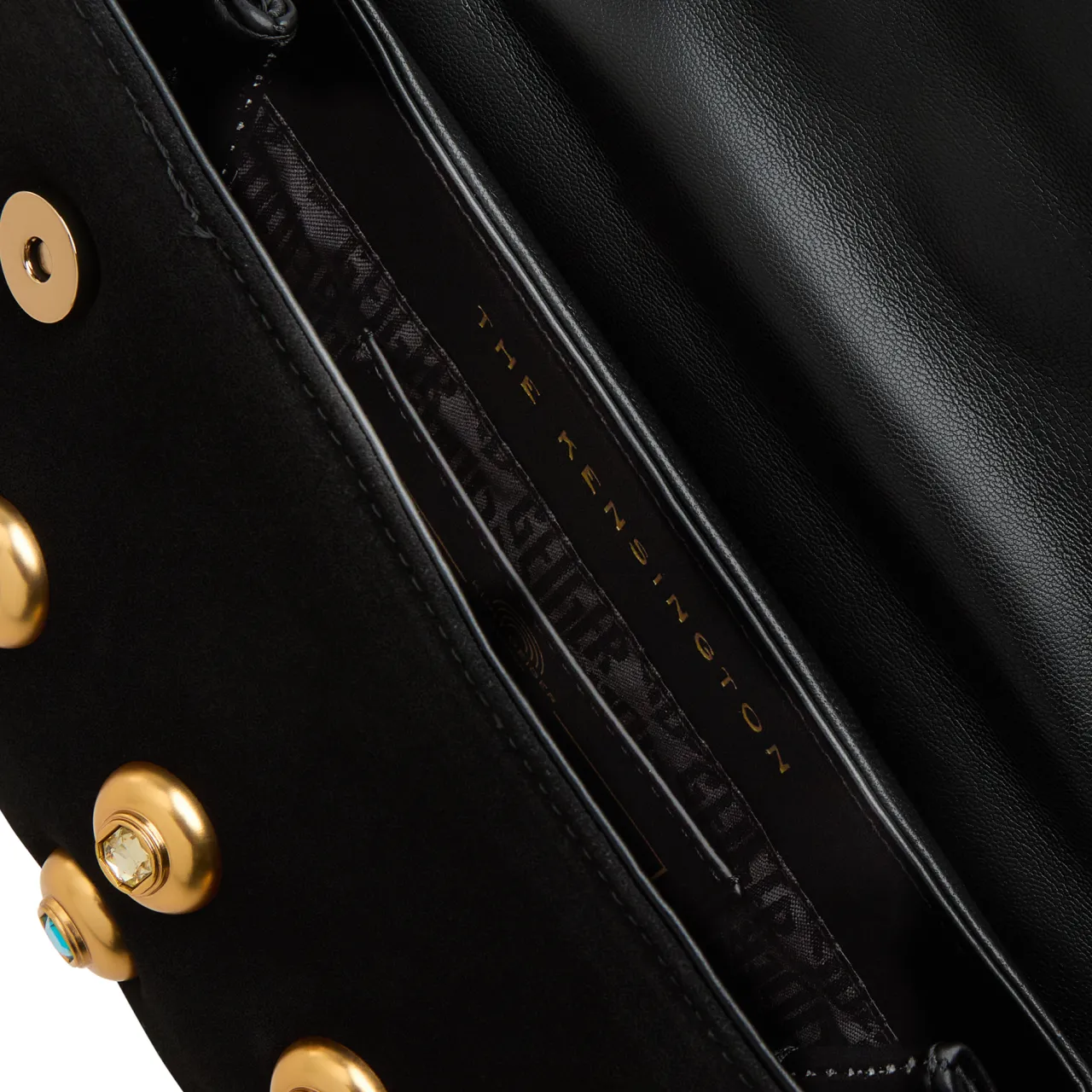- Flap closure with magnetic fastening, adjustable chain strap, bronze-toned hardware, signature eagle head charm, crystal embellished detailing, all-over jewel embellishment, quilted finish to the front, leather finish to the back, tonal stitching, rear logo branding