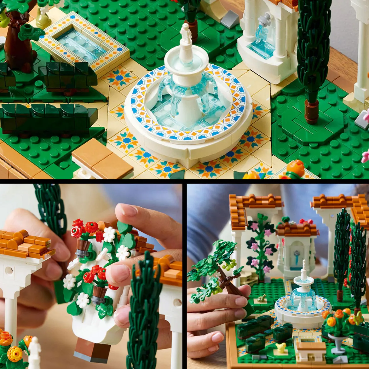 - 1,302 pieces, garden model includes decorative tiled pathways leading to the 2-tiered fountain, flowered vines adorn white columned pergolas, reconfigurable garden corners