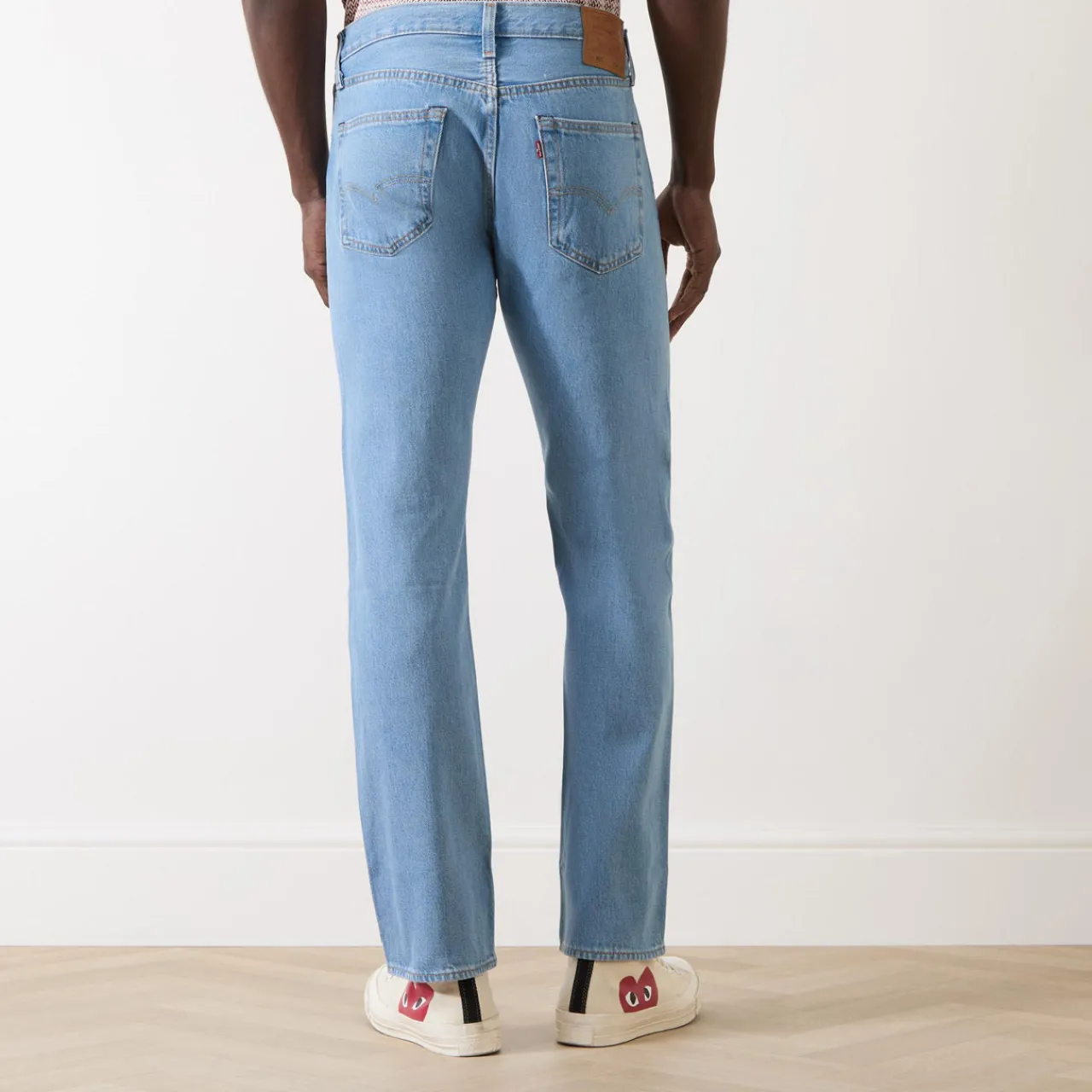 - Zip-fly and button fastening, belt loops, five-pocket design, contrast top stitching, rear logo patch, signature red logo tab, mid-rise, straight-cut leg, smooth denim finish