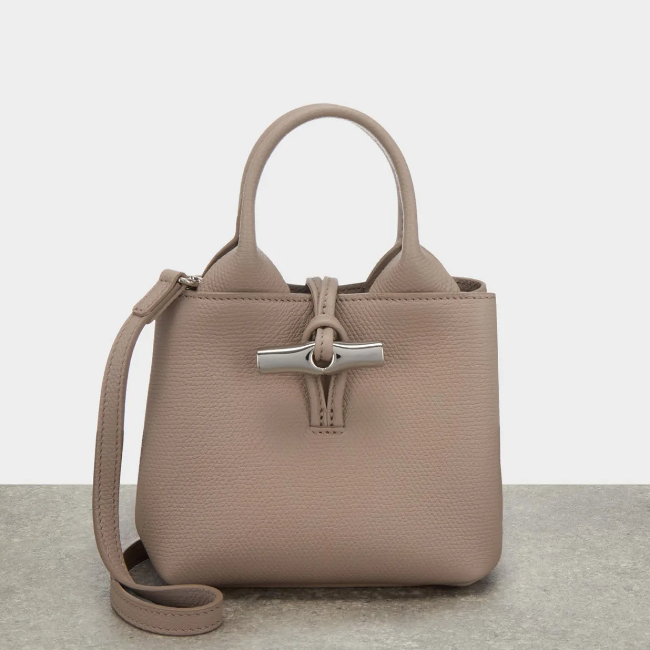 - Toggle fastening, adjustable crossbody strap, interior slip pocket, interior zip pocket, two top handles, textured feel