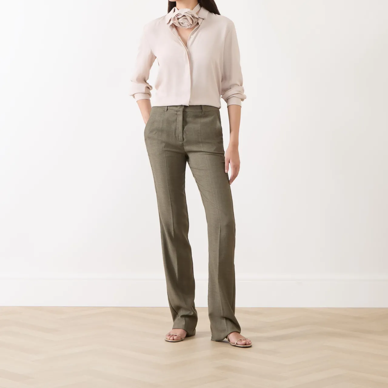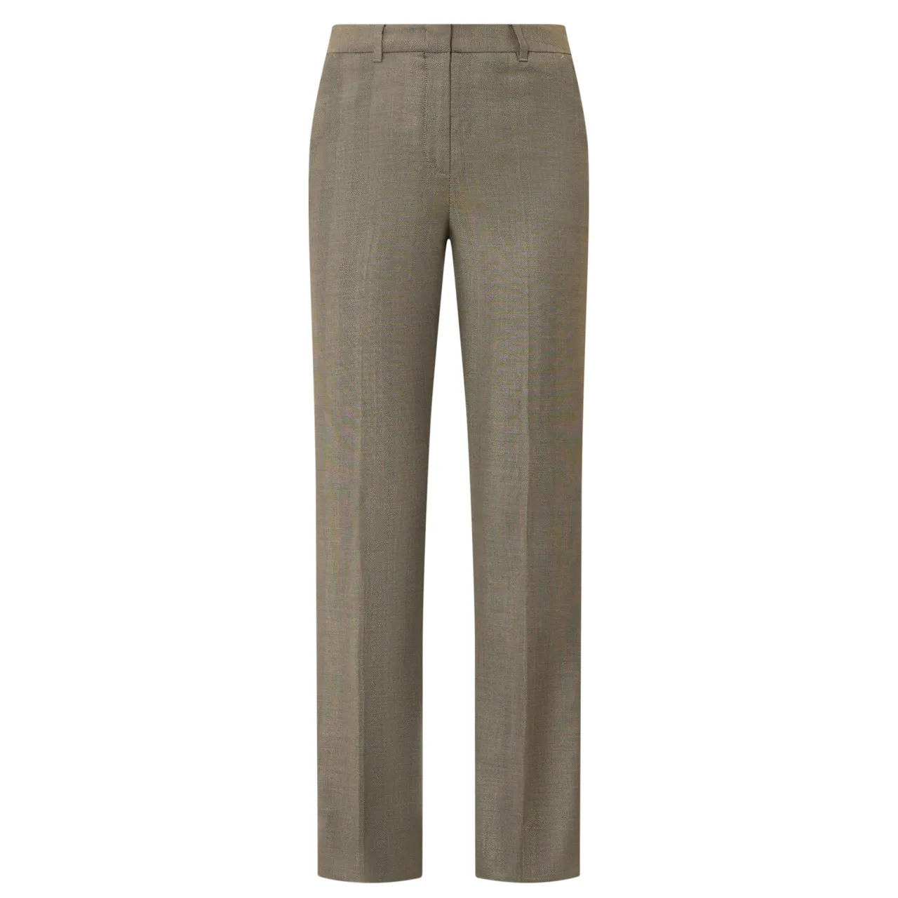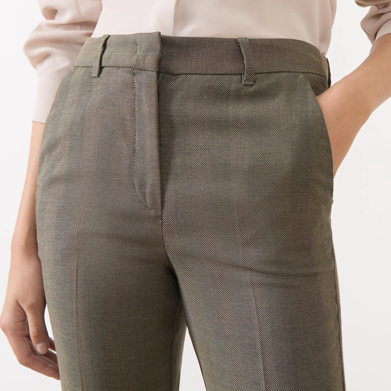 - Hook and bar with fly zip fastening, belt loops, side entry pockets, rear welt pockets, herringbone pattern, pressed creases