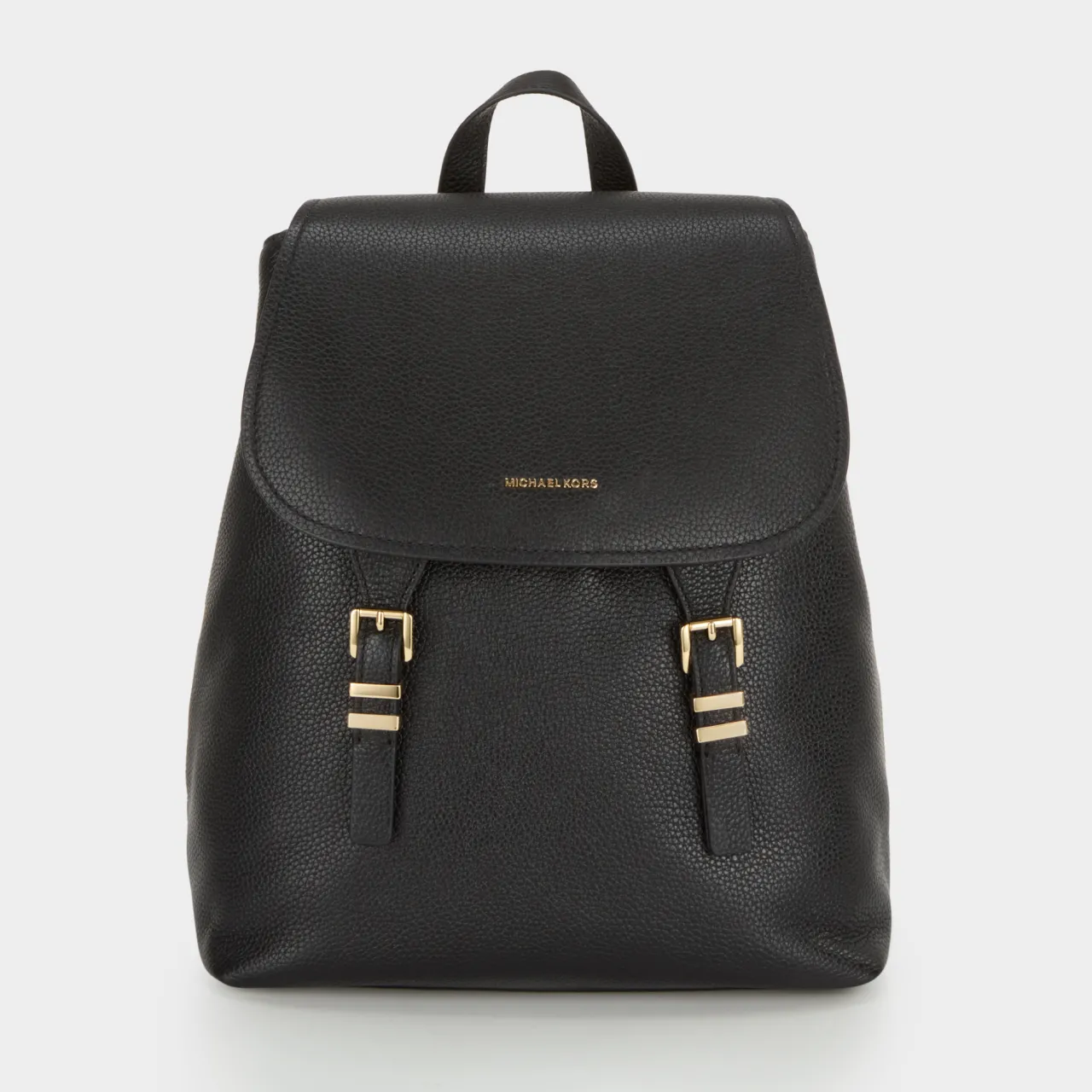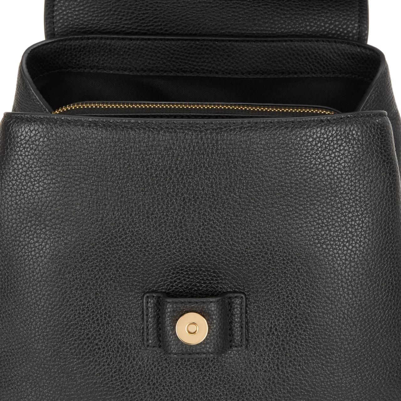 - Top carry handle, adjustable straps, gold-tone hardware, flap with strap and snap button closure, zip fastening, pebbled finish, buckle detailing, logo lettering