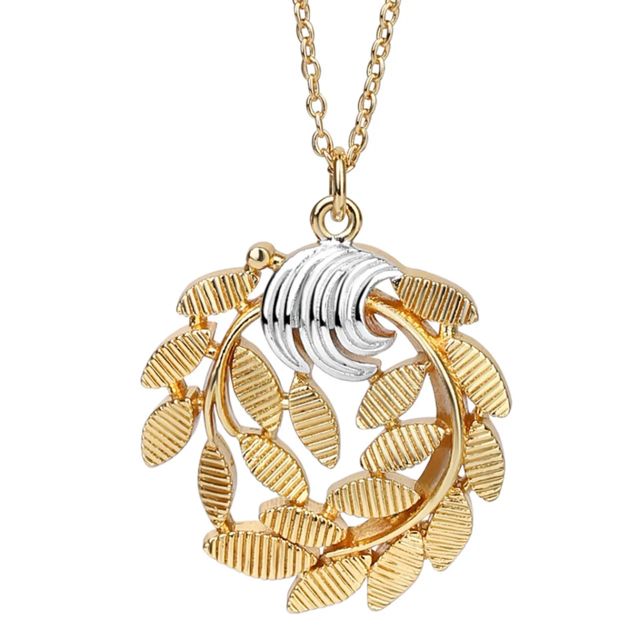 - Leaf-shaped pendant, two-tone design, fine adjustable chain, clasp fastening, matching brooch available, presented in a branded gift box