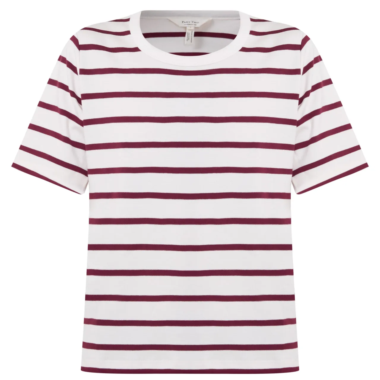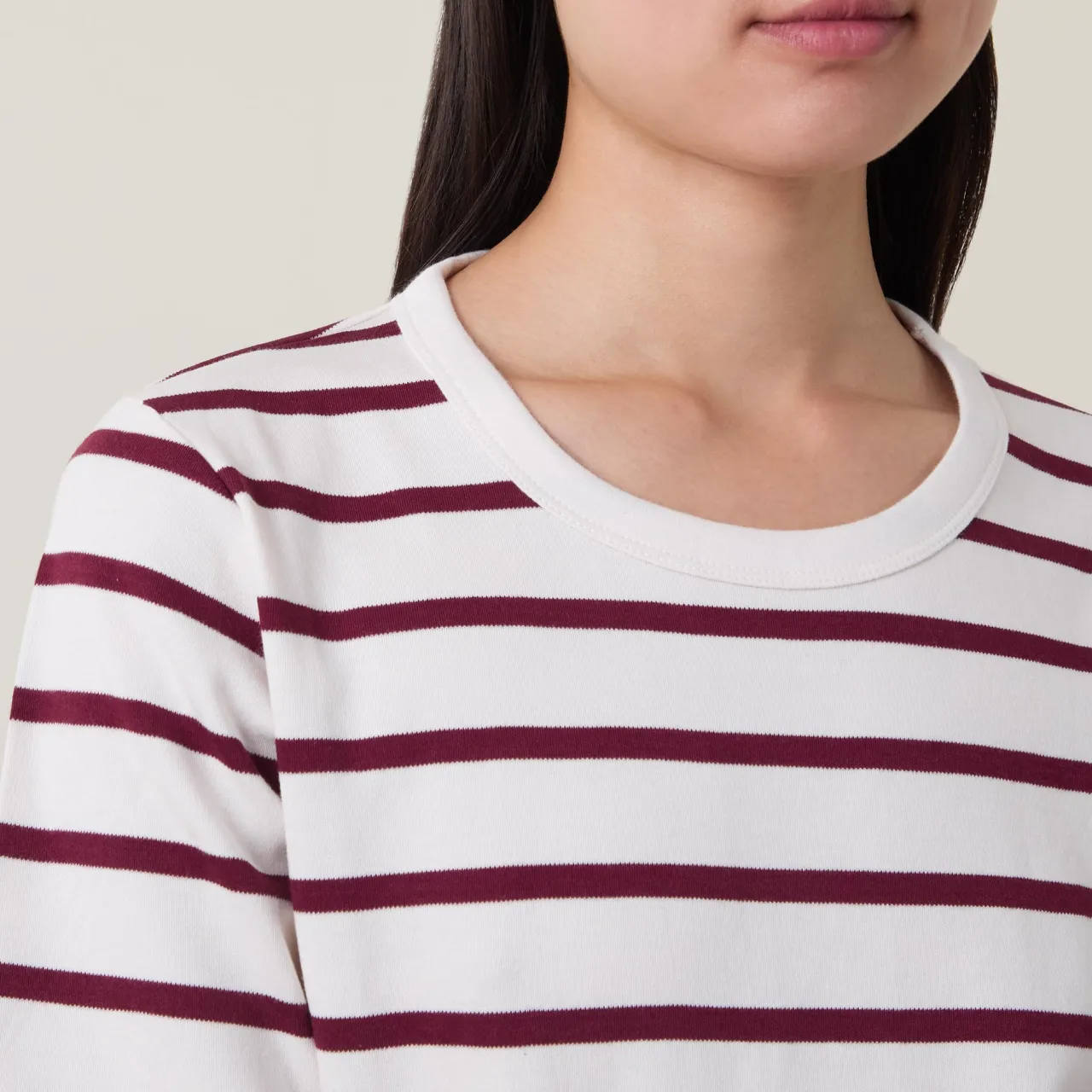 - Ribbed crew neckline, short sleeves, straight hemline, striped