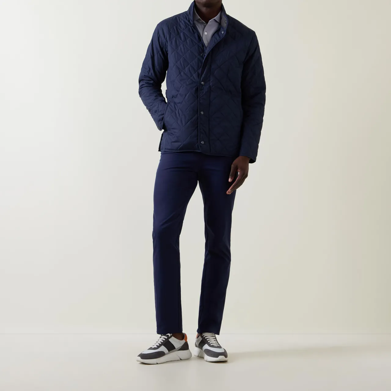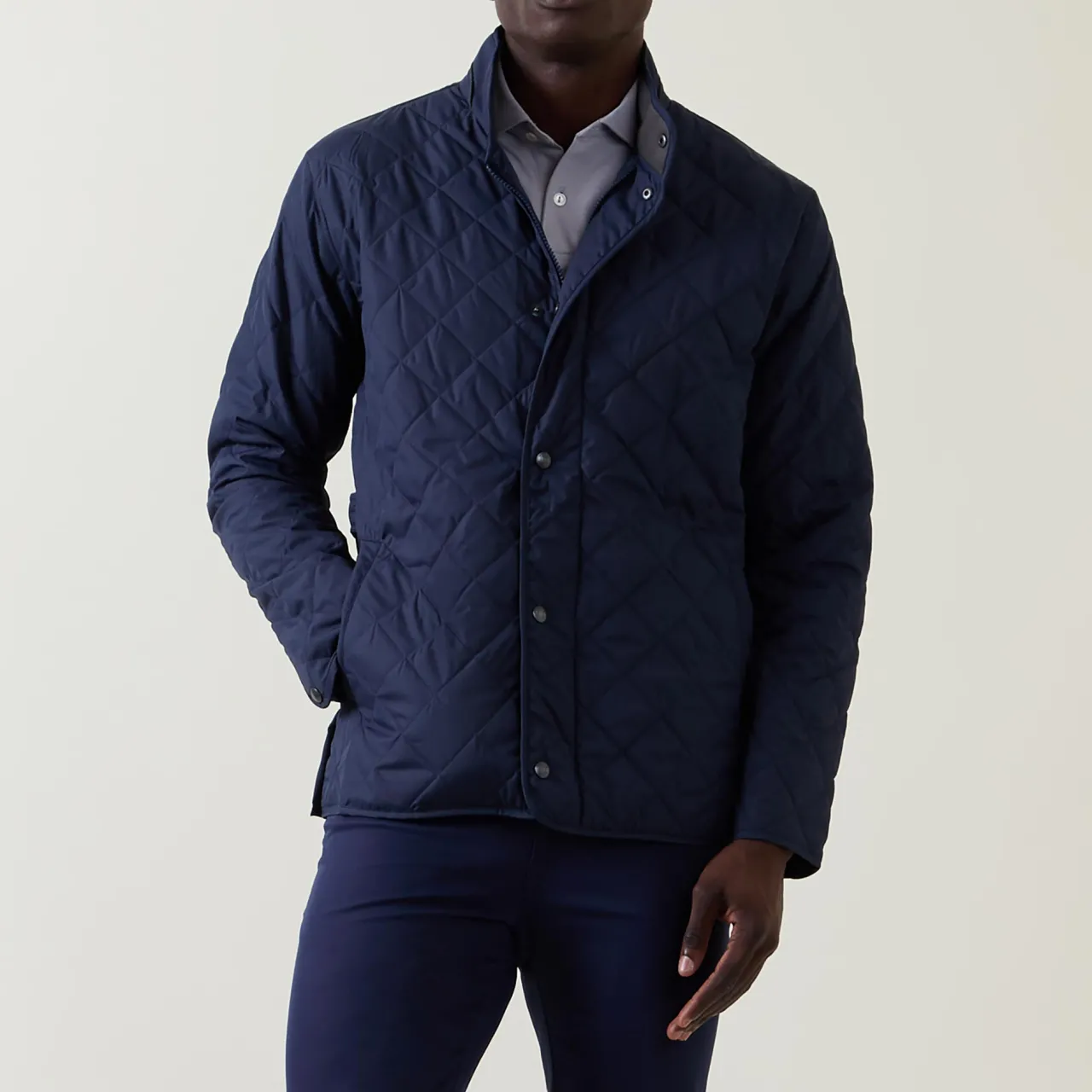 - Stand-up collar, long sleeves, concealed zip-fastening placket, snap-button fastenings, single-button cuffs, diamond-quilted finish, windproof, water resistant
