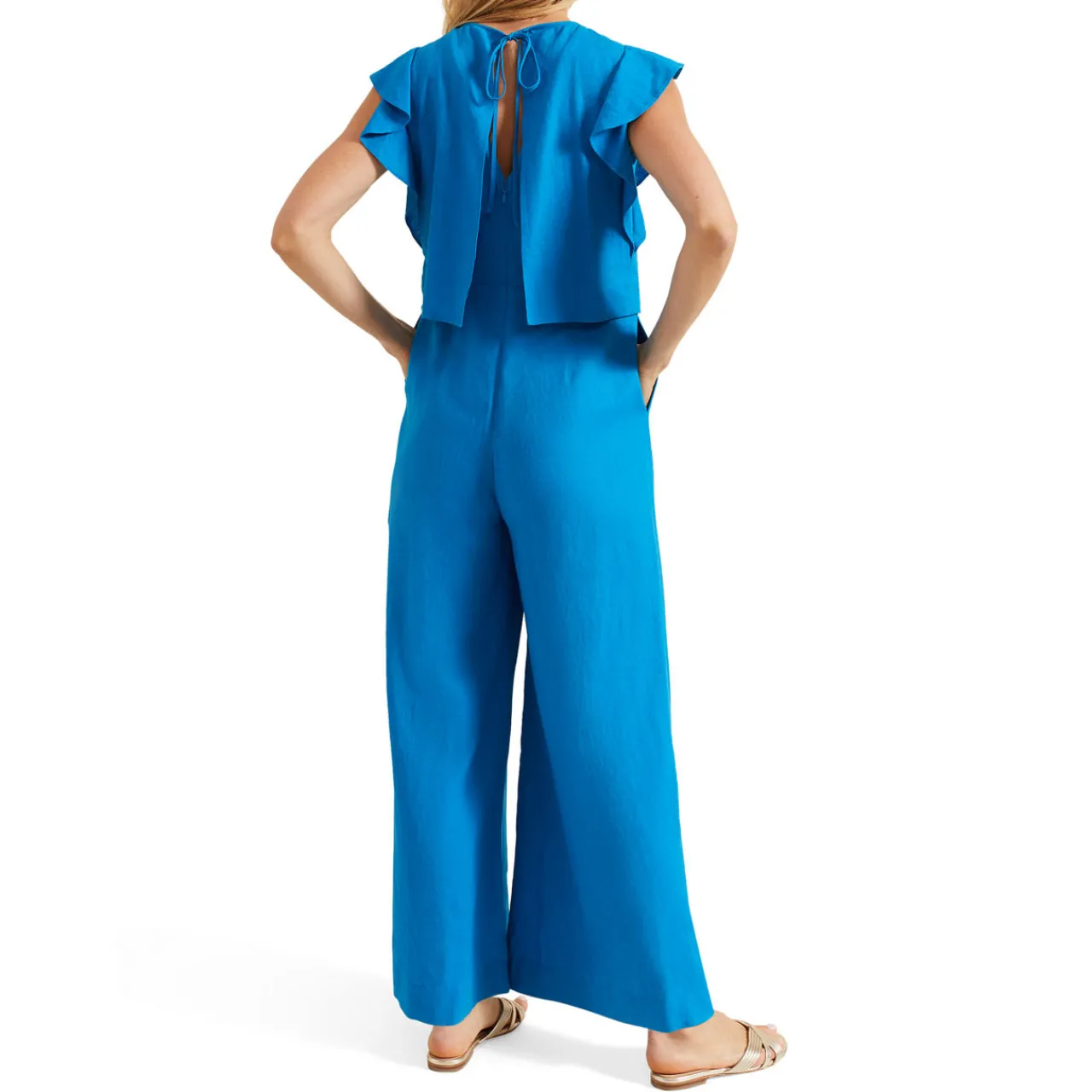 - Round neckline, frill sleeves, open back detailing with tie-fastening, slit pockets, concealed zip-fastening closure, wide-cut leg, smooth fabric