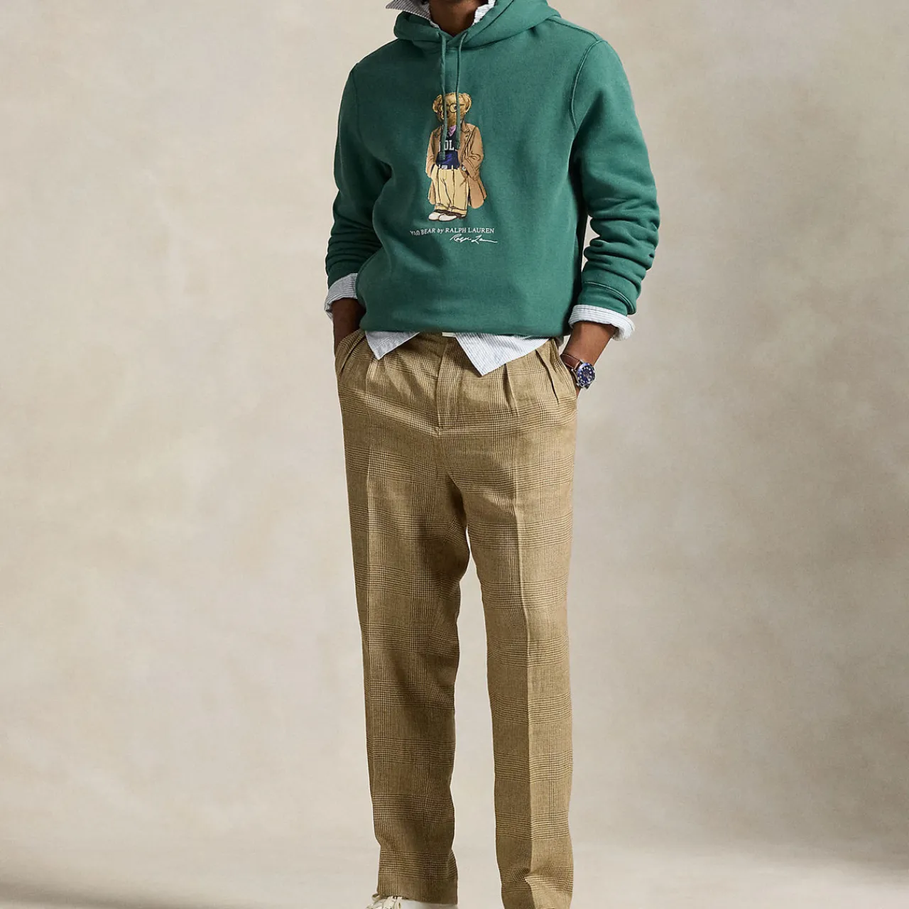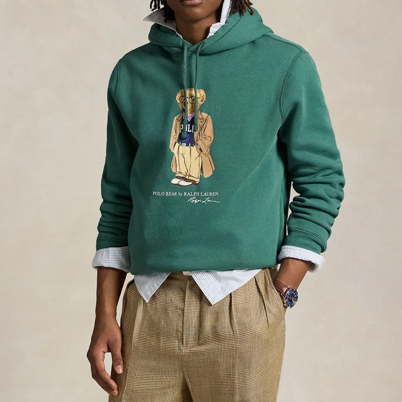- Collegiate bear design from 1996 with updates including tortoiseshell glasses and polo-emblazoned pullover, drawstring hood, long sleeves with ribbed cuffs, printed Polo Bear and Ralph Lauren script at centre front, side on-seam pockets, ribbed hem