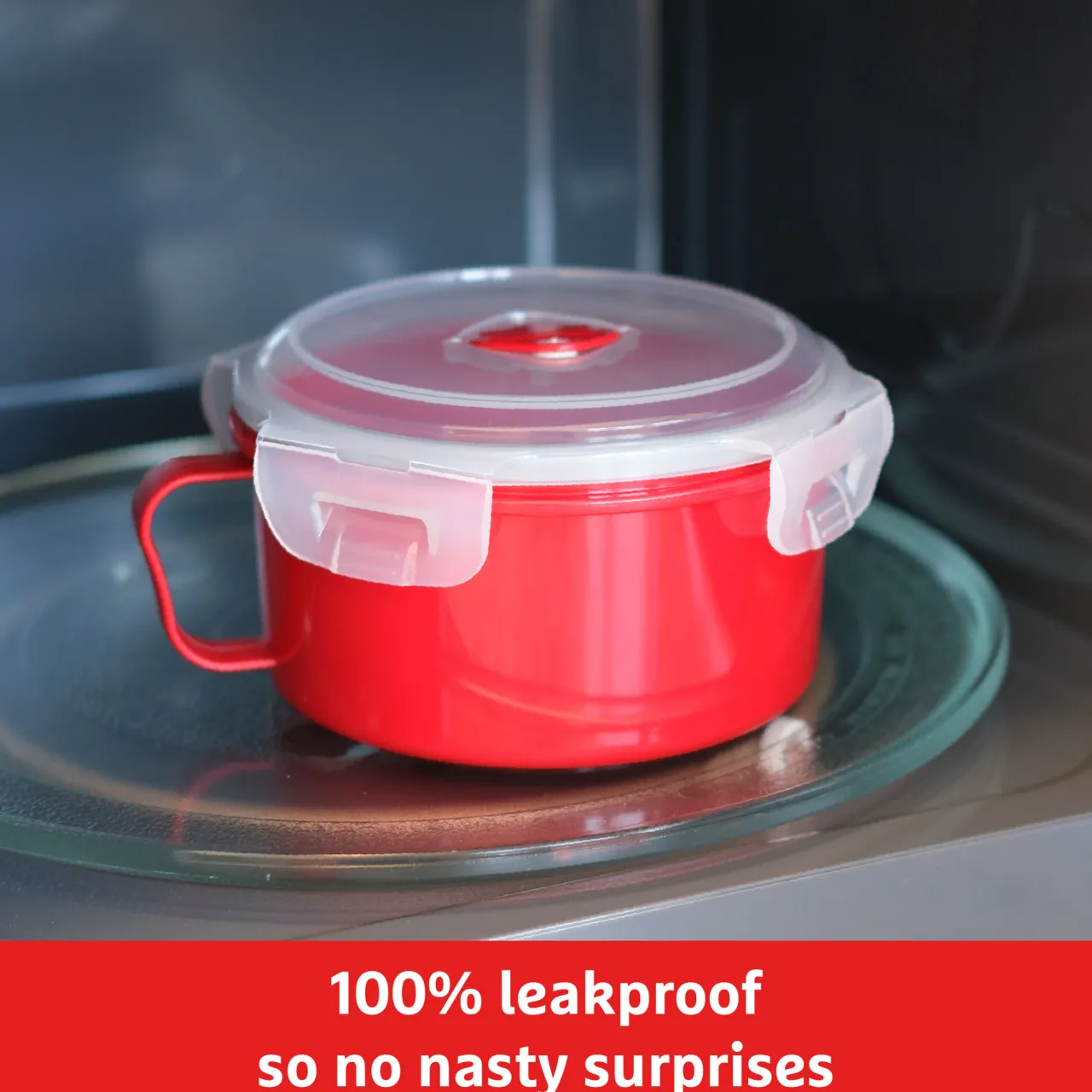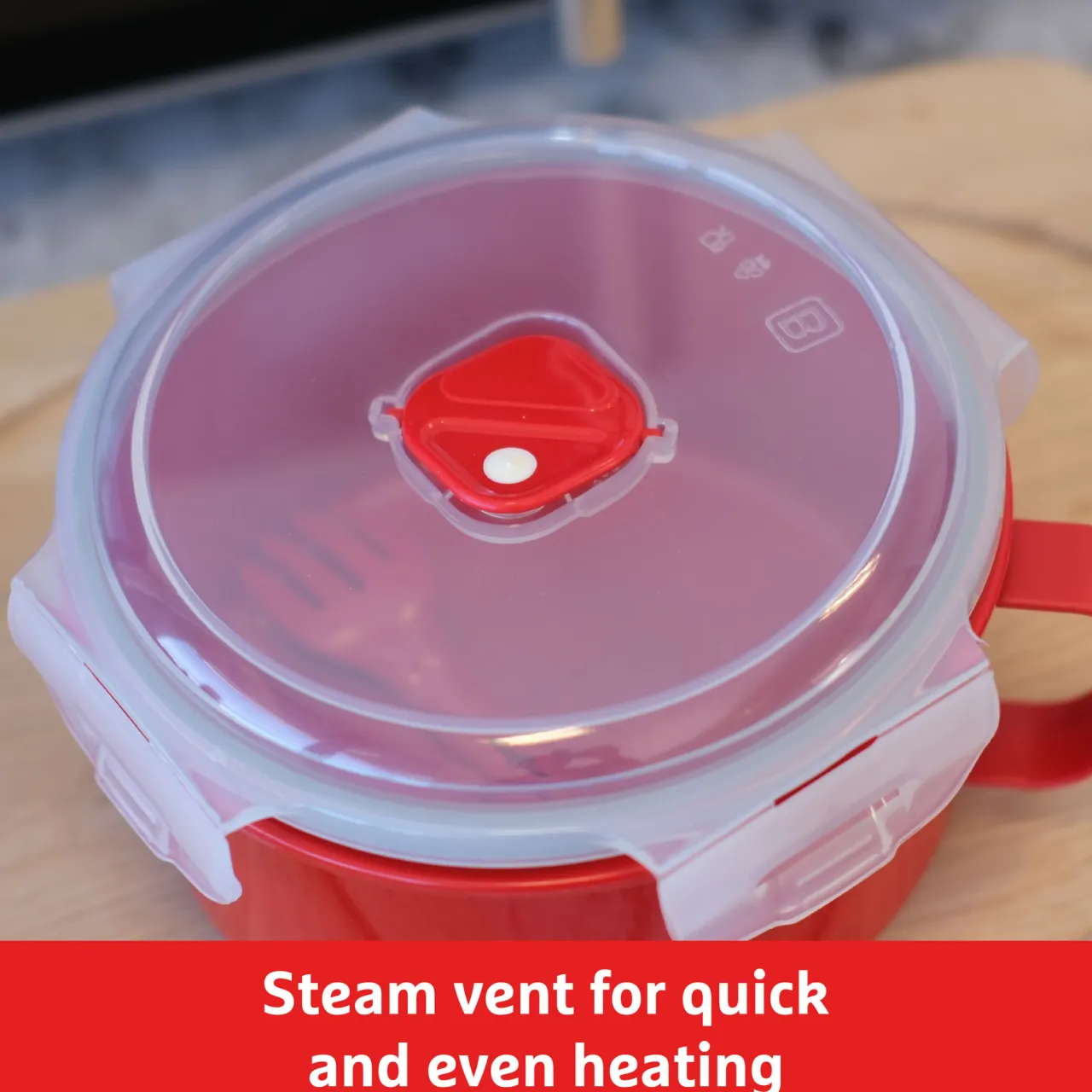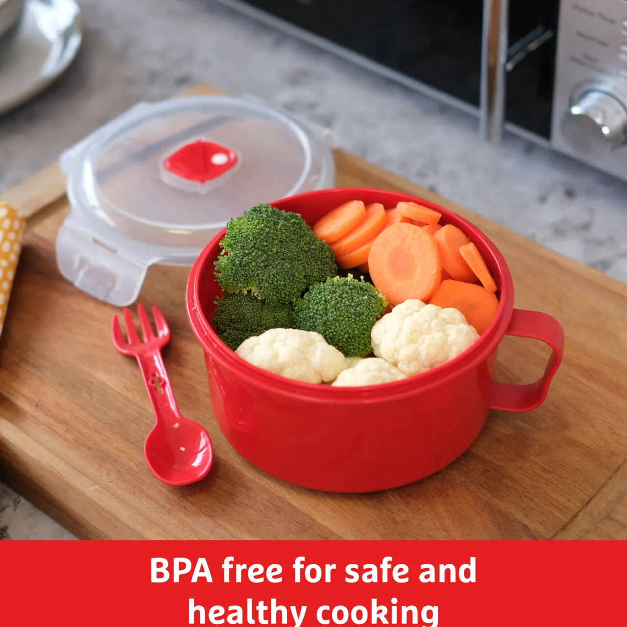 - Includes handy spork (spoon & fork combo), steam vent for quick even heating, leakproof and travel-friendly, BPA free, freezer safe, dishwasher safe