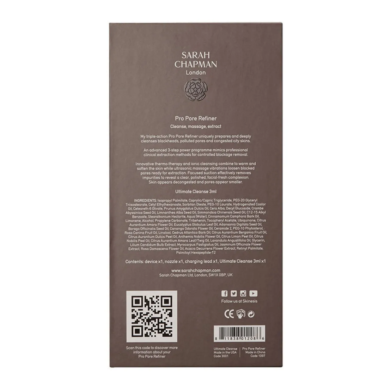 My triple-action Pro Pore Refiner uniquely prepares and deeply cleanses blackheads, polluted pores and congested city skins.An advanced 3-step power programme mimics professional clinical extraction methods for controlled blockage removal. Innovative thermo-therapy and ionic cleansing combine to warm and soften the skin while ultrasonic massage vibrations loosen blocked pores ready for extraction. Focused suction effectively removes impurities to reveal a clear, polished, facial-fresh complexion. Skin appears decongested and pores appear smaller.Contents: device x1, nozzle x1, charging lead x1, Ultimate Cleanse 3ml x1