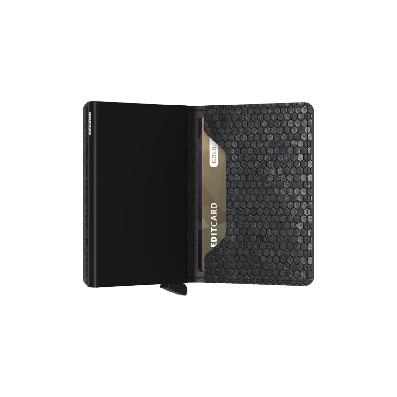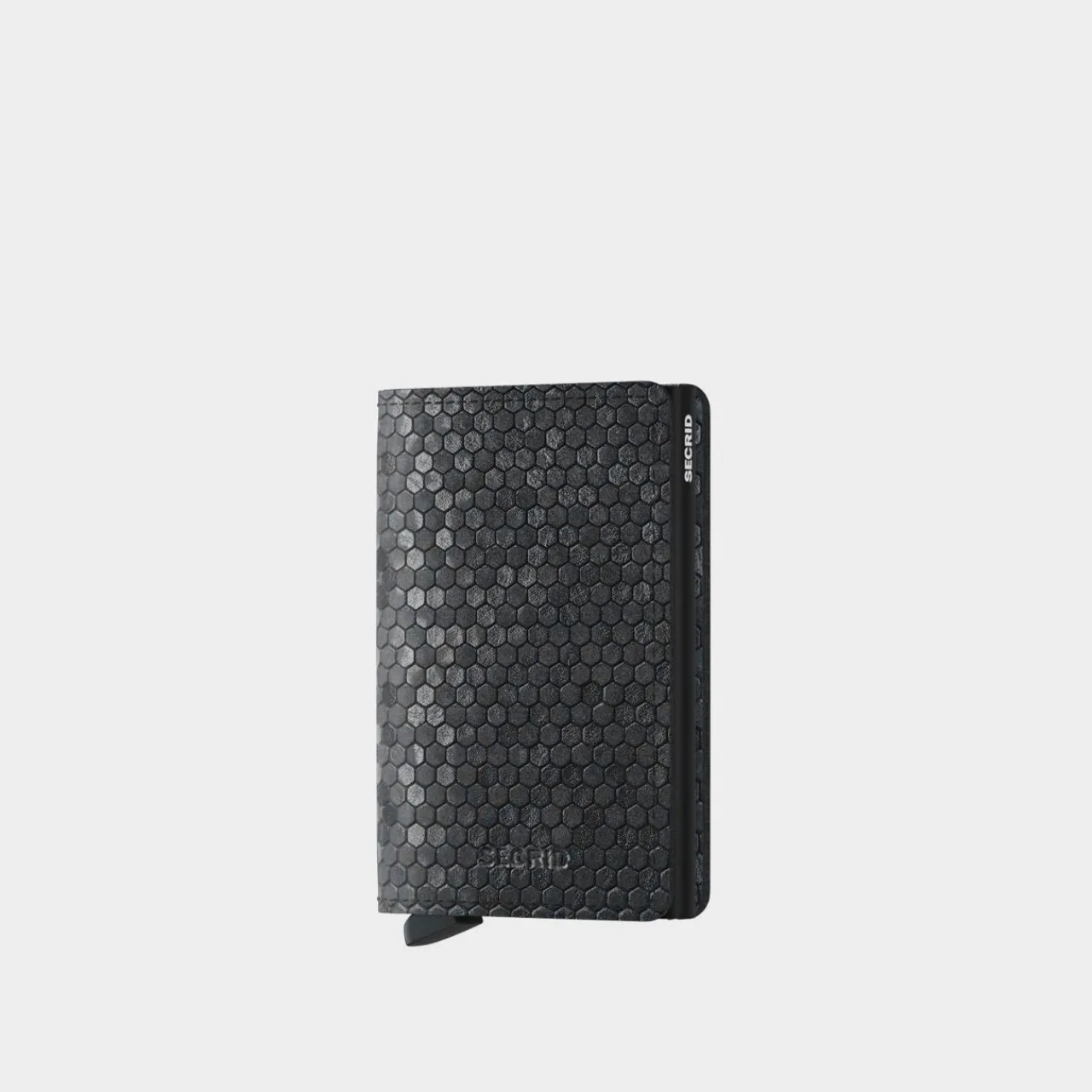 - Slim profile, extra-wide cut, Cardprotector mechanism, hexagon leather finish, brand logo details
