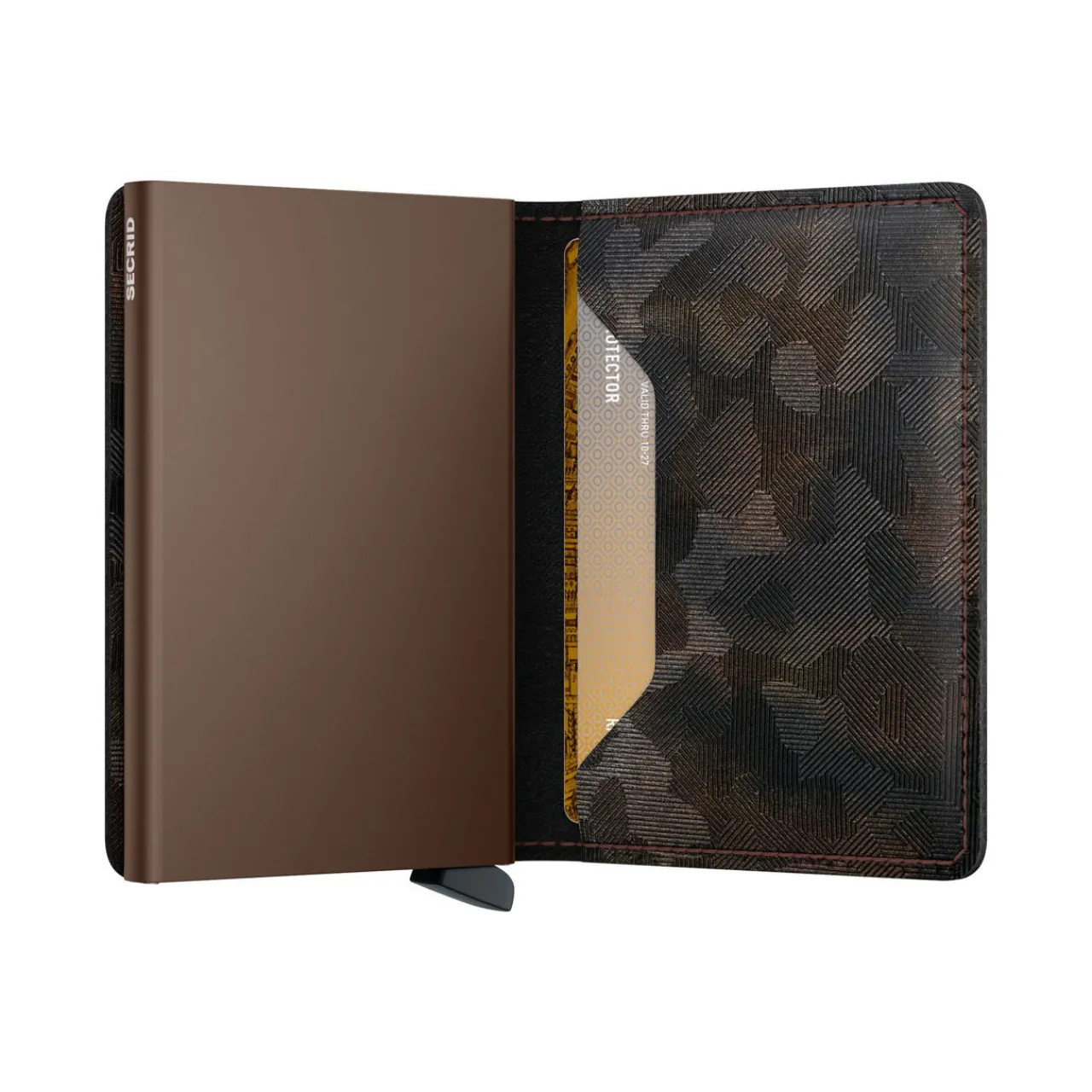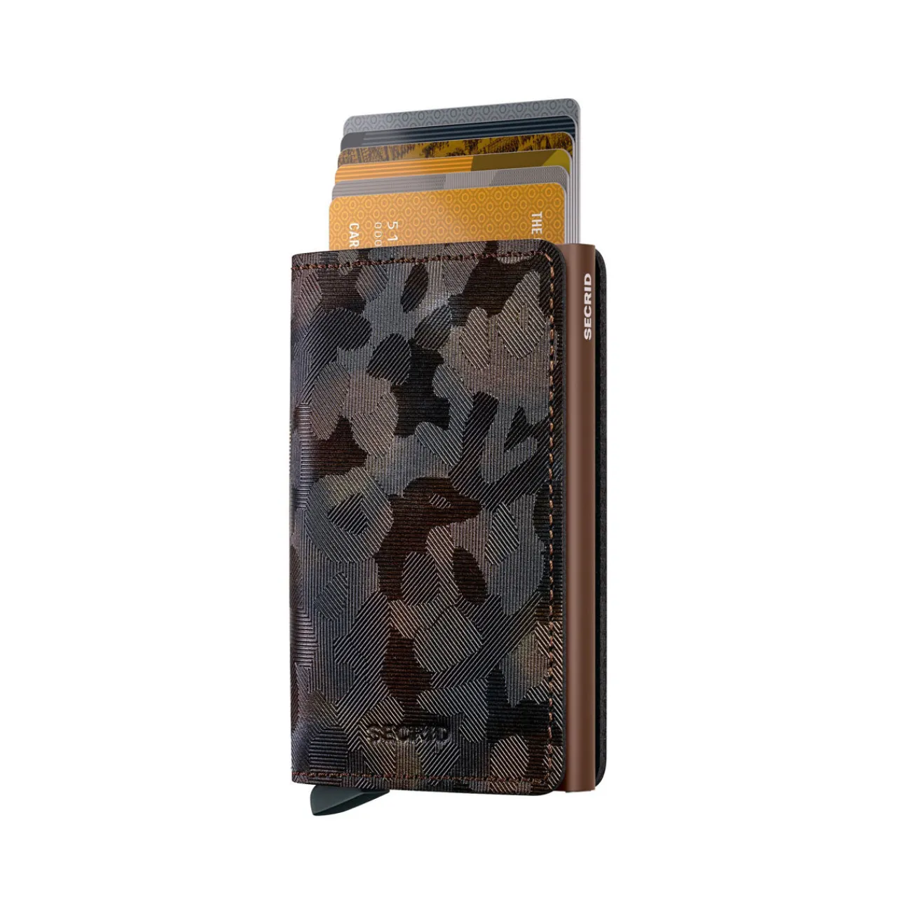 - Multi-coloured camouflage leather finish, extra slim profile, water-repellent finish, brand logo details, aluminium Cardprotector mechanism protects cards from bending and unwanted wireless communication