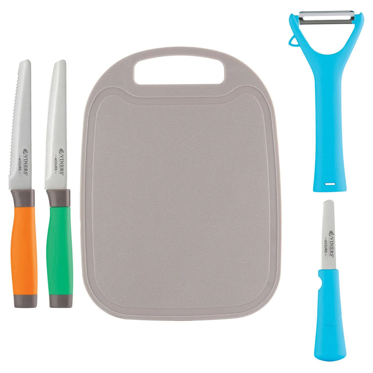 The Assure Colour Code Knife, Peeler and Board Set includes the essential items for daily food preparation. The unique Assure Duo Peeler, a multi-functional tool allows you to peel and prep with ease. The 3.5″ paring knife locks into the bottom of the peeler for safety as well as storage. The 5” utility knives are the most versatile knives in the collection. The serrated bladed knife provides ultimate sharpness for slicing through vegetable and fruit skins, whilst the straight bladed knife offers supreme control for peeling, dicing and chopping.