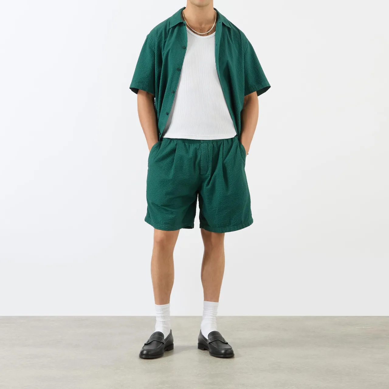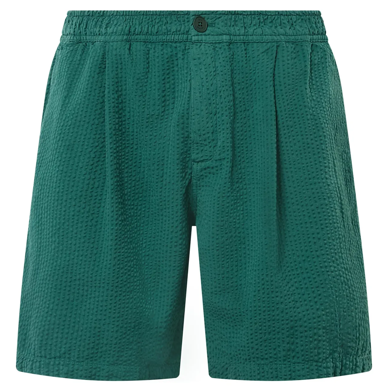 - Single button closure, elasticated waistband, two side in-seam pockets, two rear welt pockets, mid-rise, wide-cut leg, textured finish