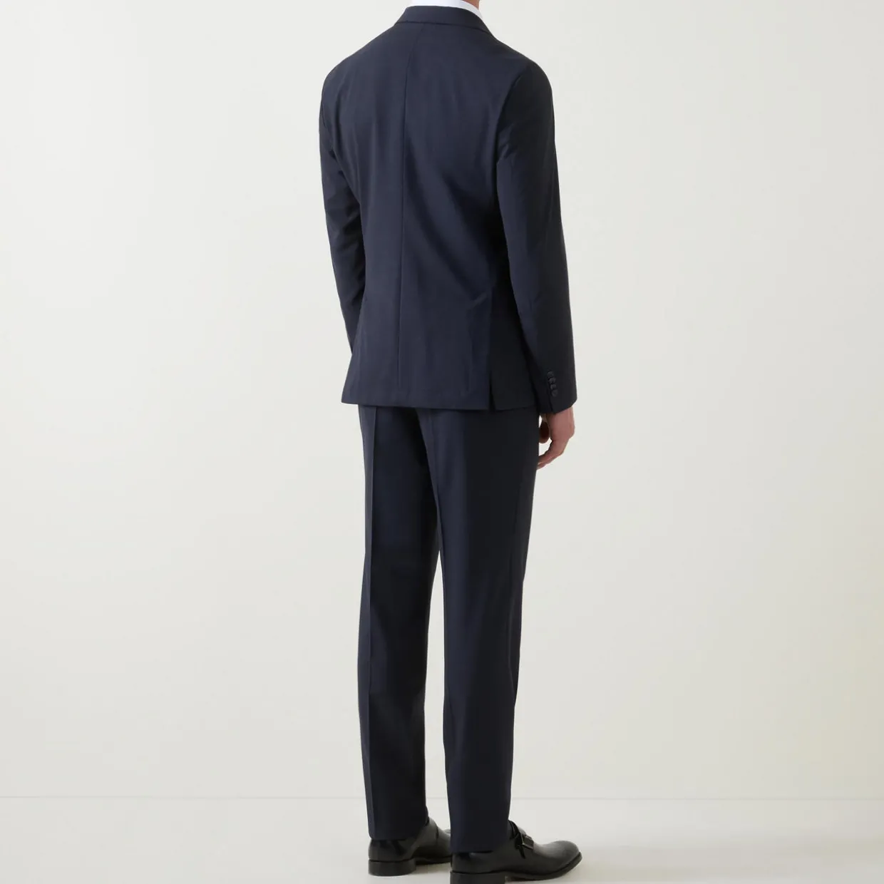 - Two-piece, micro pattern, single-breasted, button fastenings, chest pocket, long sleeves, belt loops, pleated front and back