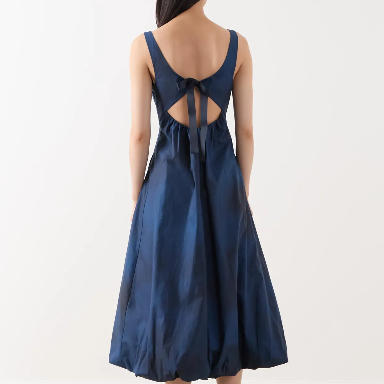 - Square neckline, sleeveless, midi length, in-seam side pockets, concealed zip fastening, porthole opening with bow detail at back, fit and flare silhouette, floral pattern, adjustable drawstring at balloon hem