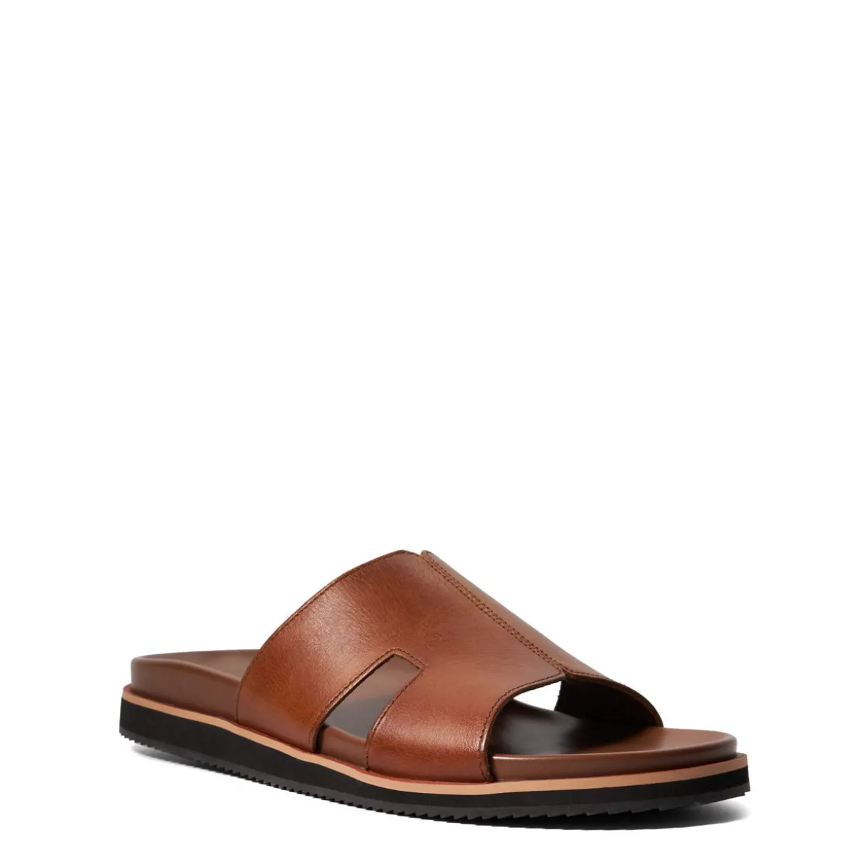 - Leather sandals, open toe, cushioned footbed, flat sole, backless silhouette
