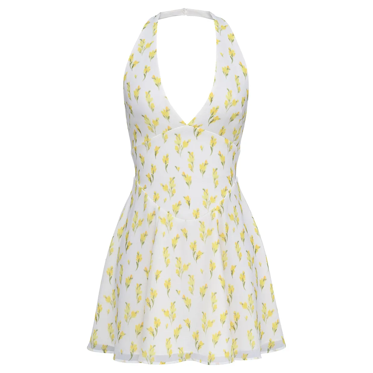 - Halter neck cut, back neck tie, ruching around the bust, zip at back