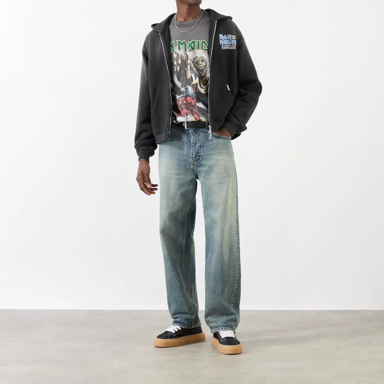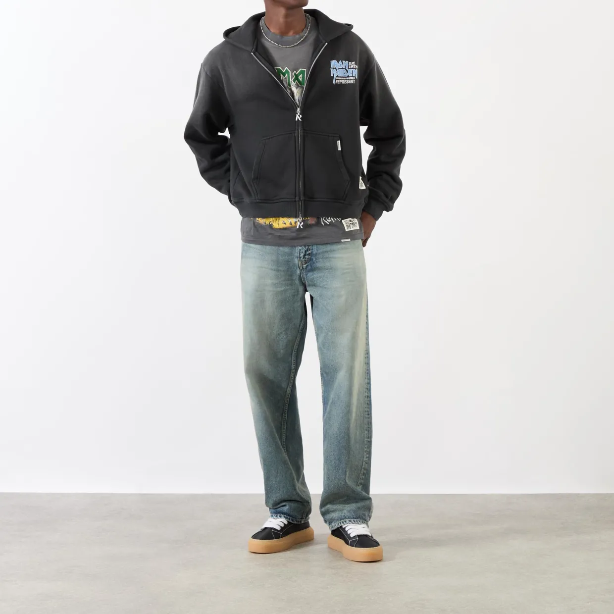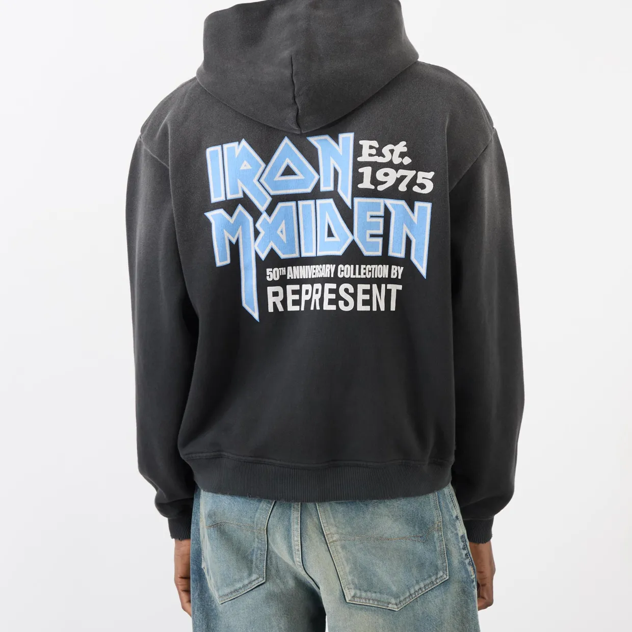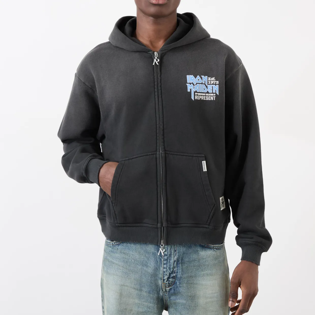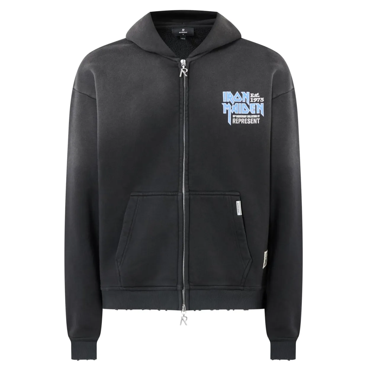 - Hooded, long sleeves, logo detail, zip fastening, Iron Maiden print, split pouch pocket, washed effect