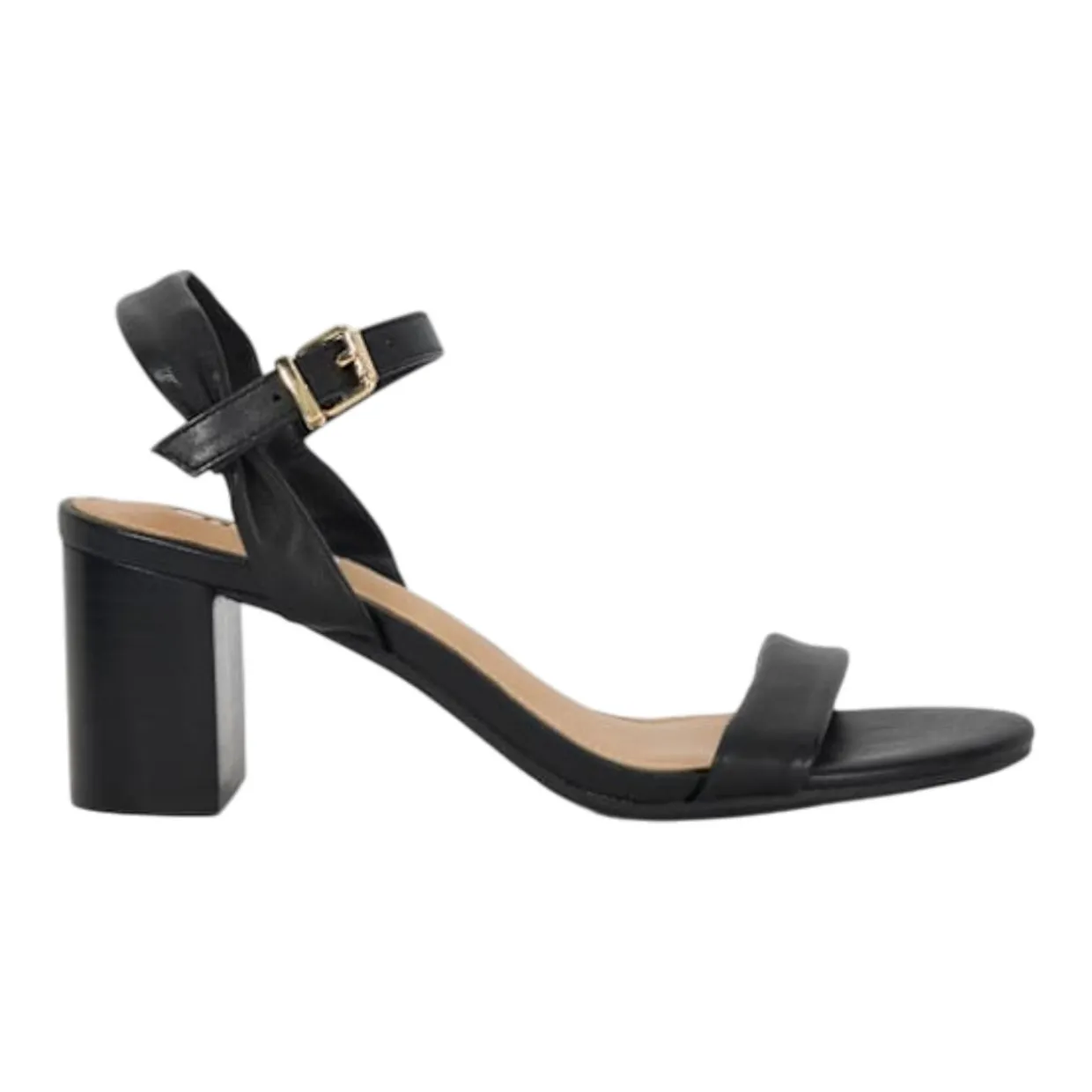 - Open-toe design, almond-shaped toe, adjustable ankle strap, gold-tone buckle fastening, sturdy stacked block heel
