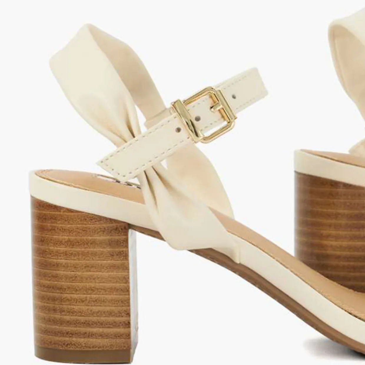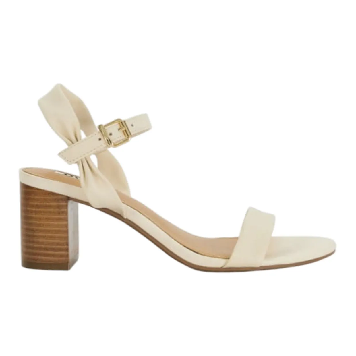 - Open-toe design, almond-shaped toe, adjustable ankle strap, gold-tone buckle fastening, sturdy stacked block heel