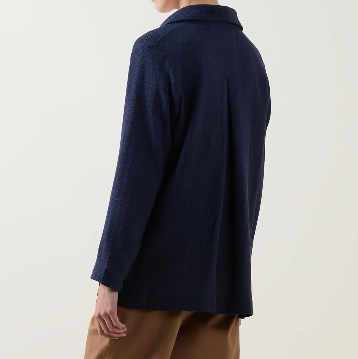 - Single-breasted front, long sleeves, shawl lapel collar, front button fastening, two side in-seam pockets, textured finish