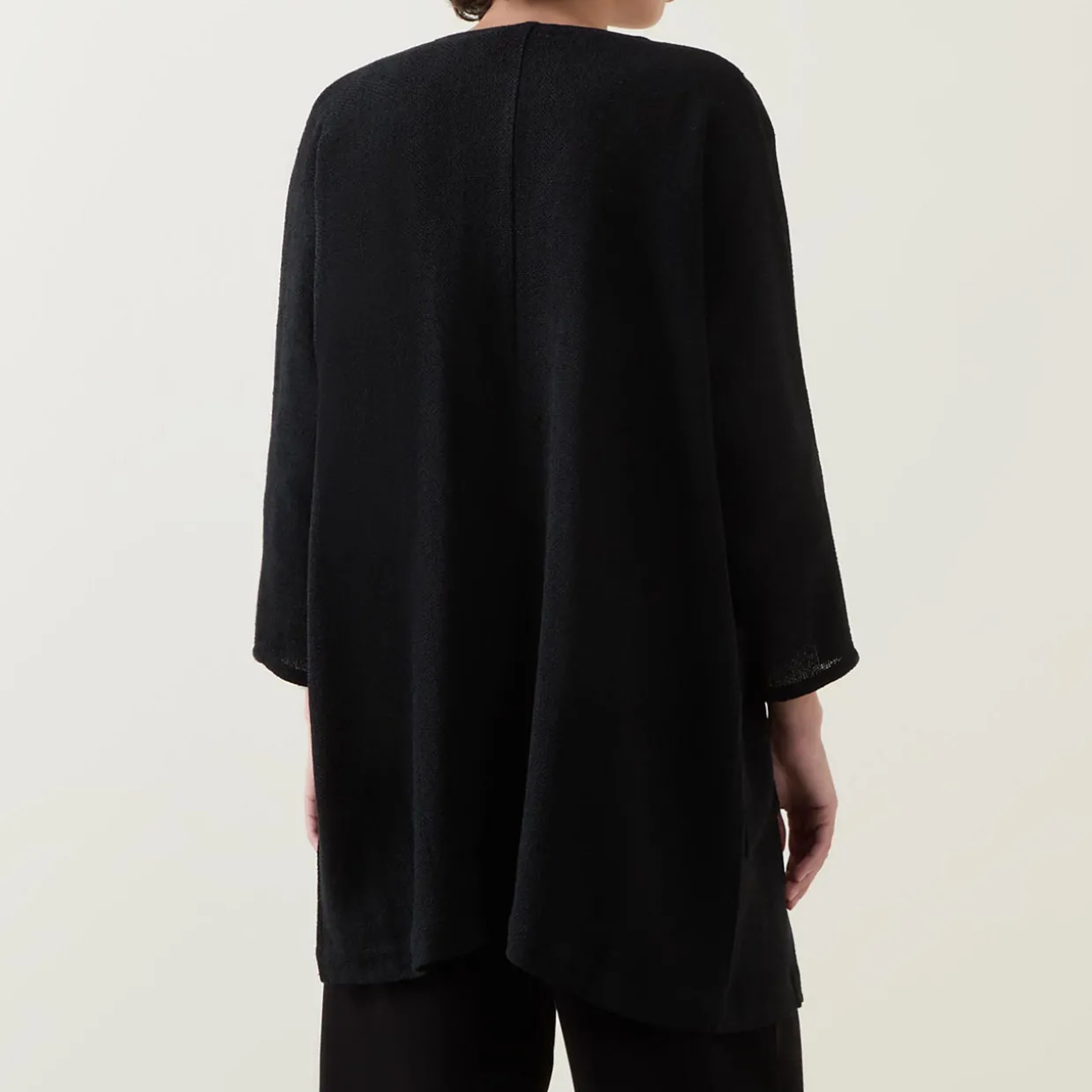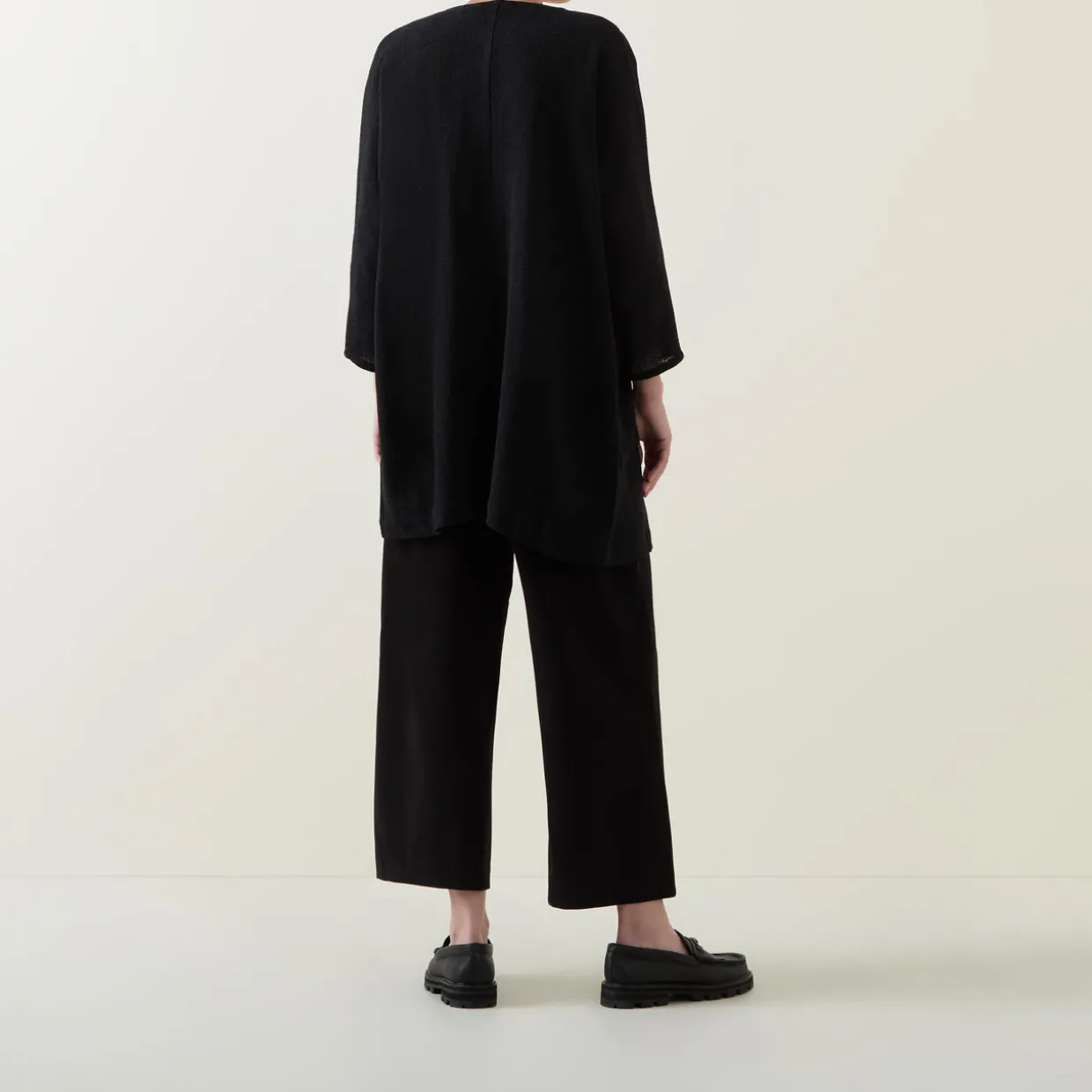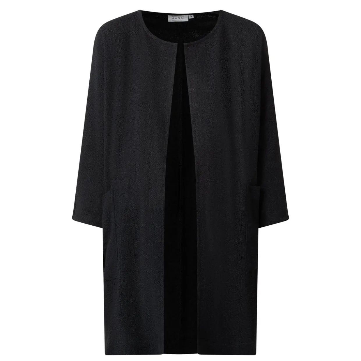 - Mid-length, round neckline, open front, long sleeves, longline length